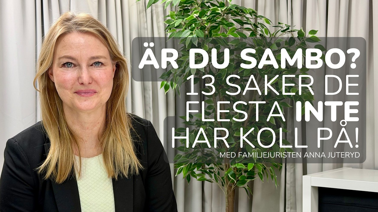 Vilka är de viktigaste sakerna att tänka på som sambo? Behövs samboavtal? Vilka är de vanligaste missuppfattningarna och misstagen? Hur gör man om man har olika stora ekonomier? Kan man göra samboskapet likvärdigt som att vara gift i juridisk mening? Det är några av frågorna vi pratar om med den seniora familjejuristen Anna Juteryd från Lexly.