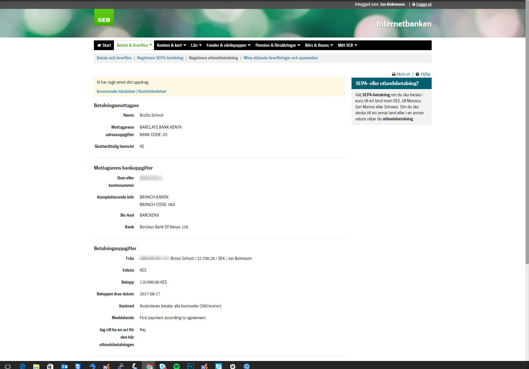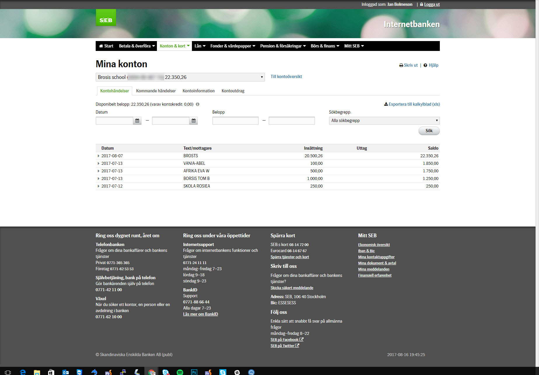 Han förklarade även hur han tänkte och hur budgeten balanserades och hur pengarna som vi skänkte skulle kunna användas för att täcka kostnaderna tills dess att han kunde öka elev-antalet. Jag kände mig nöjd och bestämde mig för att skicka över hälften av pengarna, vilket också syns på kontoutdraget ovan. Jag har också lovat att ha kontinuerliga avstämningar med honom under hösten för att se att det går i rätt riktning.