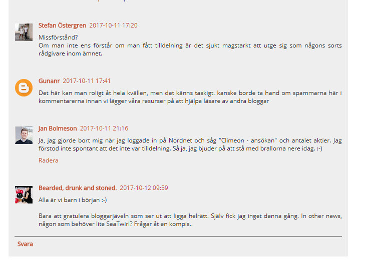 De senaste veckorna har varit lite stökiga med väldigt mycket jobb, så i onsdags hoppade jag snabbt in på min Nordnet-depå och såg att där stod ”Climeon 6000 st”. (egentligen stod där ”Climeon ansökan – 6 000 st). Min första tanke var: ”Helvete!” (resten cenuseras). Nu har jag fått full tildelning vilket i samma ögonblick betydde att jag hade fel kring mitt antagande om överteckning. Spekulationen i Climeons börsintroduktion var just att den skulle övertecknas. Den andra tanken var: