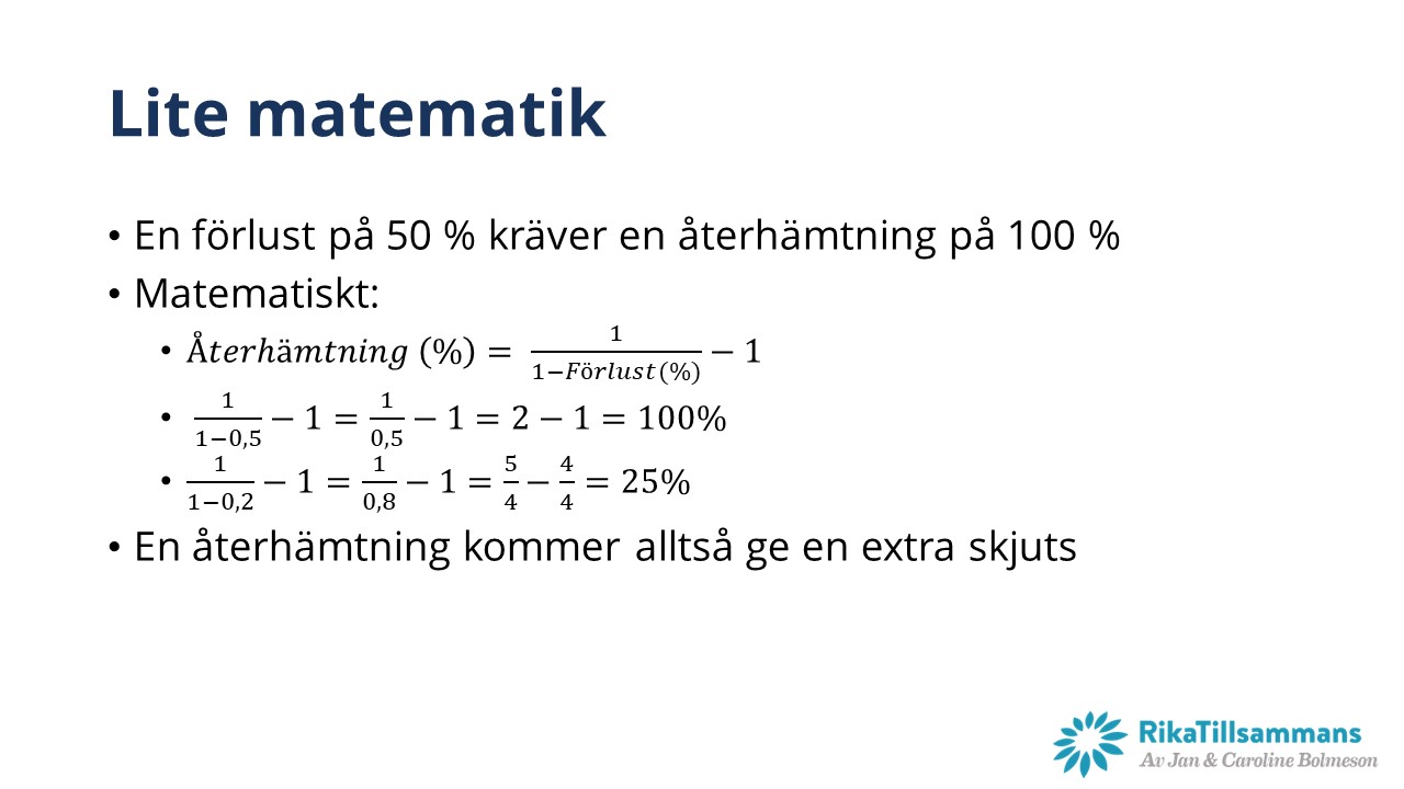 Jan: Om vi då tittar mer på matematiken. Jag roade mig med lite algebra här innan. Det var formeln för återhämtning för jag tänkte att vi skulle titta på den här förlusten och återhämtningen matematiskt. Baserat också på inspiration från Nick. Då konstaterade vi att en återhämtning i procent är enligt formeln nedan.