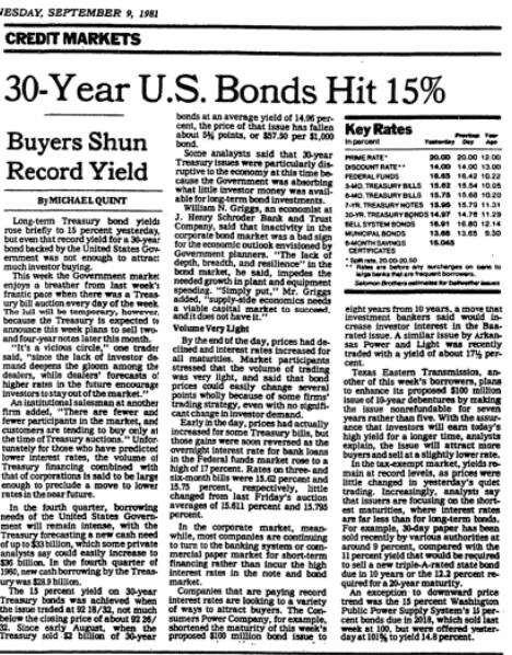 One million dollars invested at that time would have been paying out $150,000 a year in interest for 3 decades. Can you imagine how much demand there would be for bonds yielding 15% for that long today? The funny thing is when bond yields hit these levels in 1981 no one wanted to buy them.