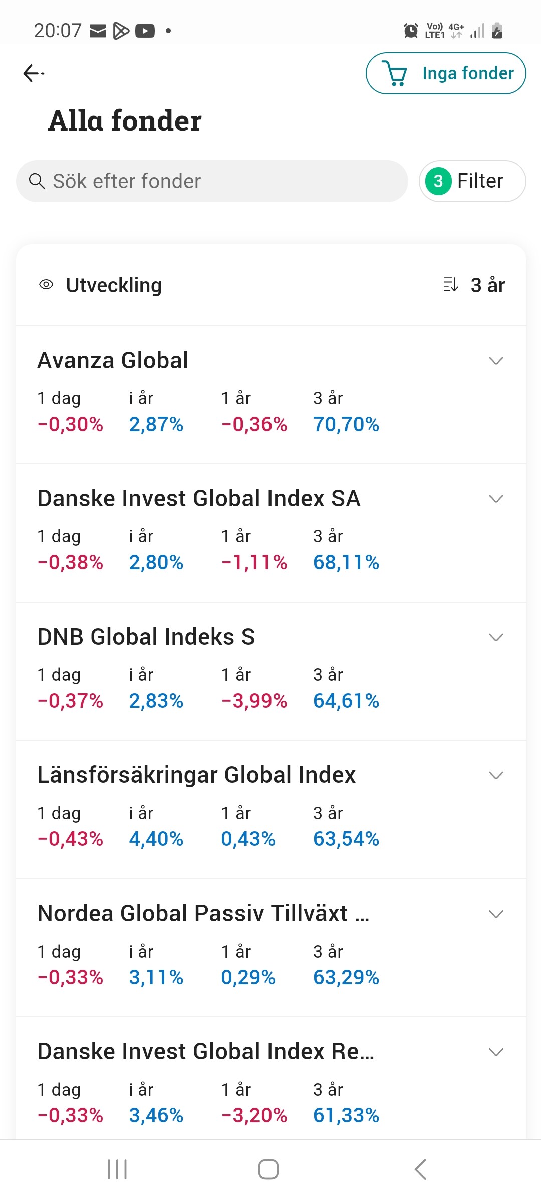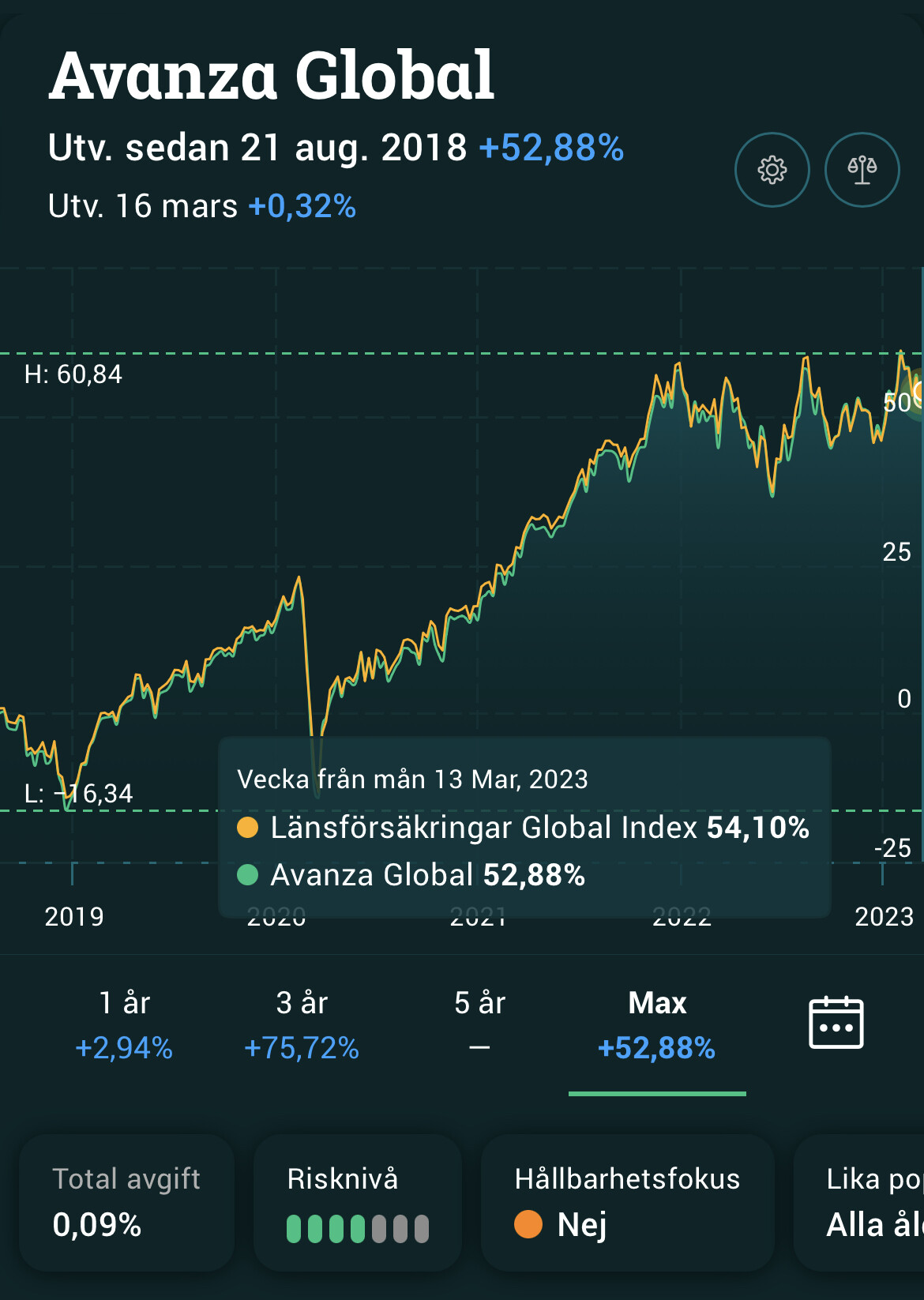 Jag personligen har valt att ha två globala fonder på senaste tiden, mest för att minska fondrisken och bredda mig lite under dessa tider. Jag kör 50% LF Global och 50% Storebrand global all Countries. Storebrand följer ett lite bredare index inkl. tillväxtmarknader.