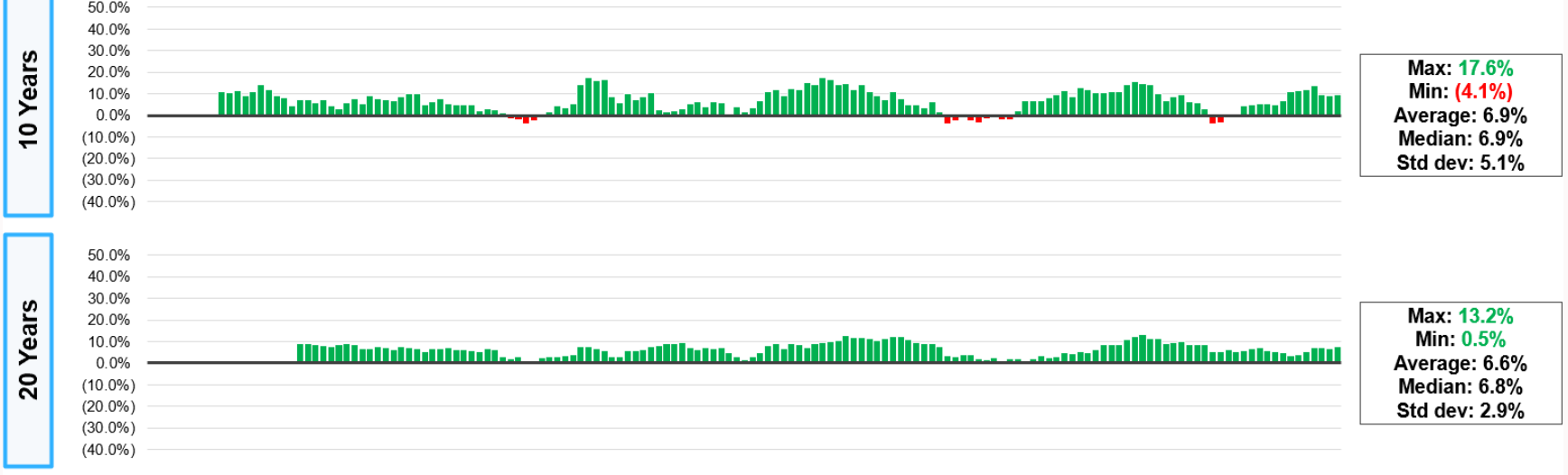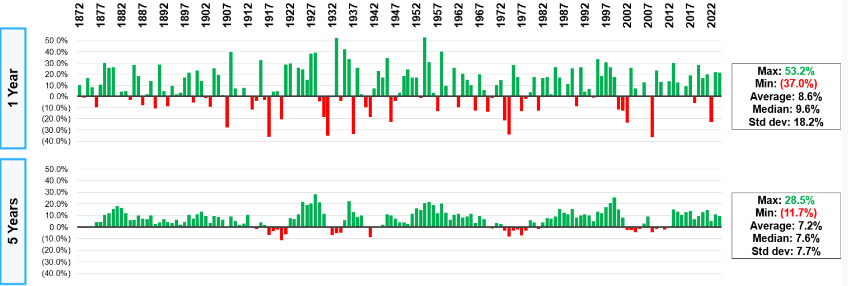 Kolla gÀrna denna kalkyl som visar hur stor genomsnittlig vÀrdeökning varit per Är sett över en 10 Ärs resp en 20 Ärsperiod . 1872 till 2024. USA endast. Inflationen avdragen