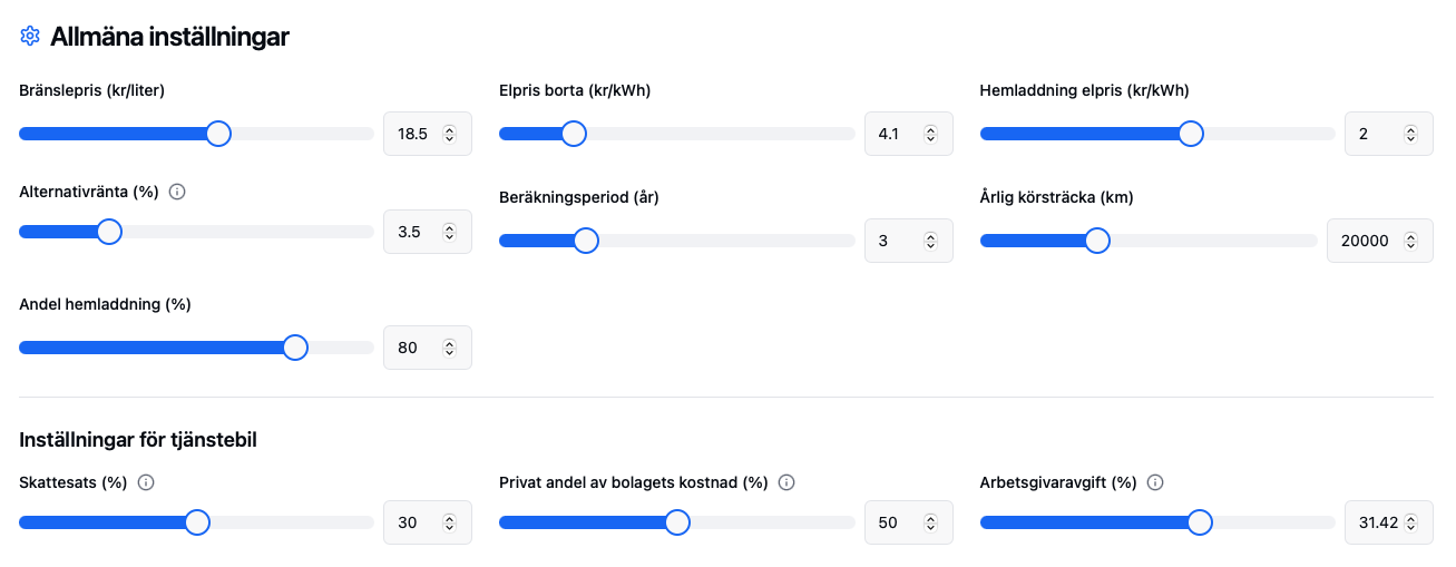 Här är parametrarna jag räknat med i mitt egna verktyg http://bilbudgeten.se/