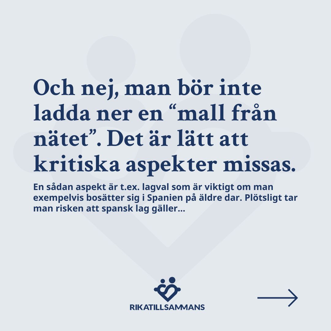 Nej, till mallar från Internet: Vi pratar även om det här med att ladda ner en mall för testamente på nätet. Även om många mallar är bra, så upplevde vi att det är asymmetriskt fel att använda dem.