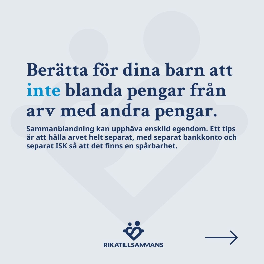 En annan sak vi pratar om är att inte sammanblanda arv som är enskild egendom med gemensamma pengar. Att typ starta ett nytt bankkonto, investeringssparkonto som heter typ: “Arv från mamma/pappa” och inte beblanda dem med andra är ofta klokt. Om inte kan nämligen rätten till enskild egendom gå förlorad och bevisbördan ligger på en själv.