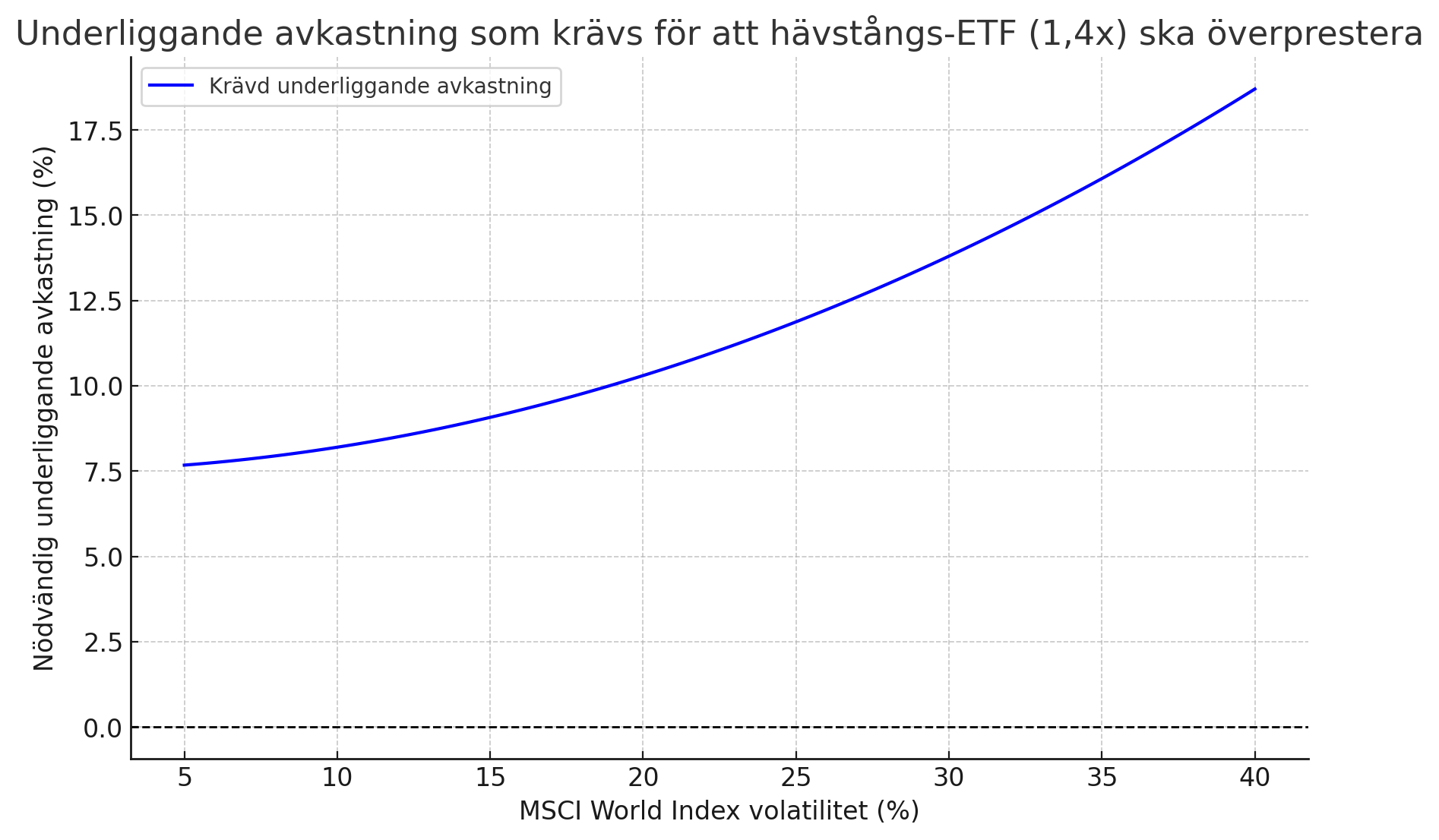 Ju högre volatilitet desto högre avkastning krävs av en hävstångsprodukt för att matcha en ren indexfond. Ett exempeldiagram jag slängde ihop med lite antagna siffror. Notera dock att jag inte själv vet hur ofta den ombalanserar.