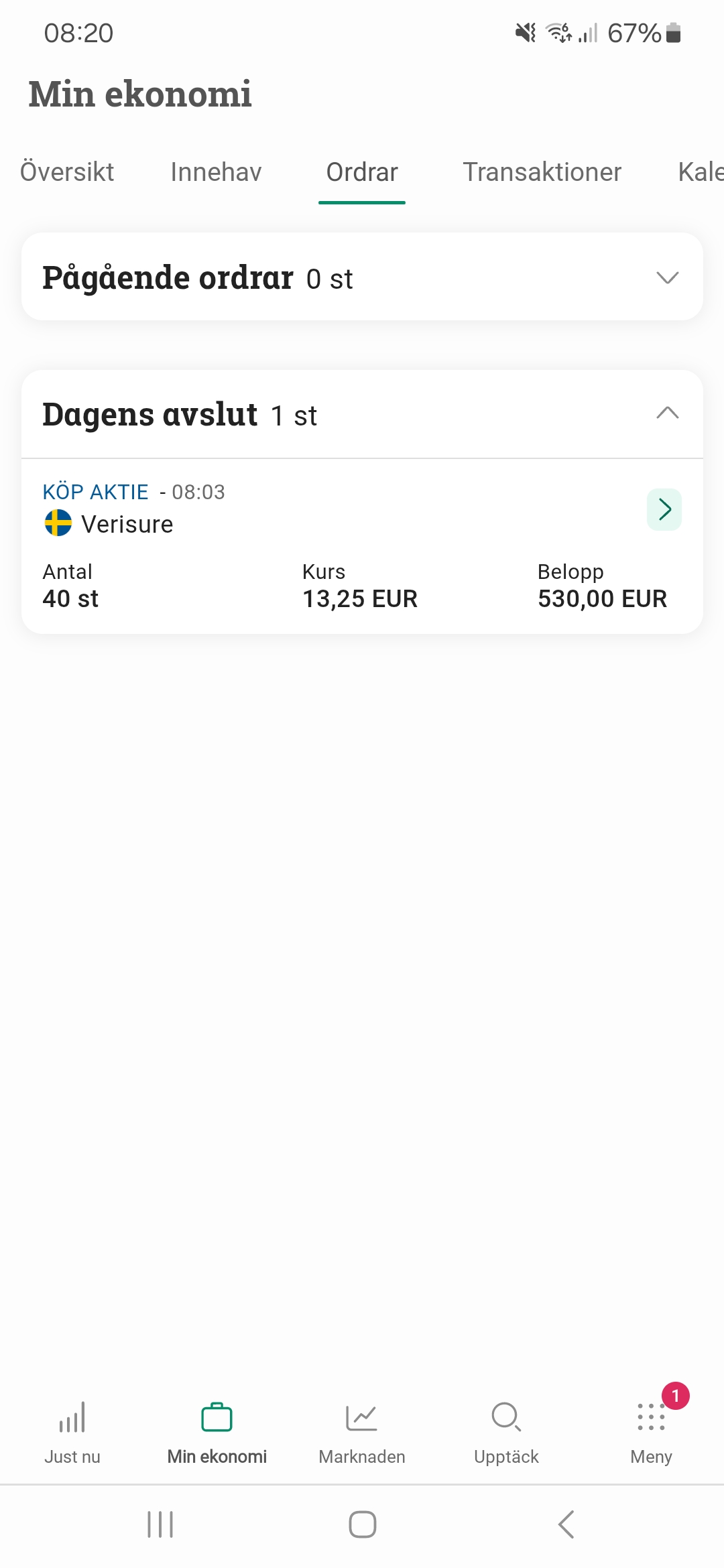 Som sagt, tänk på att teckna-sälj går ut på att sälja idag (om man inte gör som André). Störst rörelse kommer att sannolikt ske nu mellan 09.00-09.15 och därefter 1645:1730 om historien är en guide. Jag brukar sälja hälften nu på morgongen och hälften i eftermiddag. Jag tror att André sa väl att han säljer 30% nu på morgongen, 30% i eftermiddag och därefter håller han det andra en period. Men jag har tendens att glömma bort saker, så jag säljer allt idag. Inga Verisure aktier efter 1730 för mig.