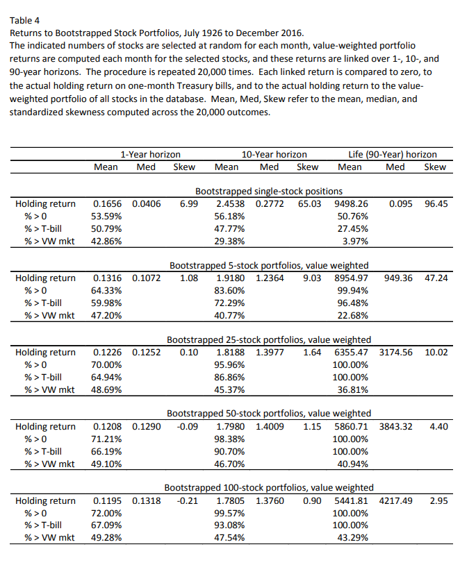 Där visar Bessembinder att genomsnittliga avkastningen faktiskt ökar ju färre bolag man håller, samtidigt som medianen sjunker.