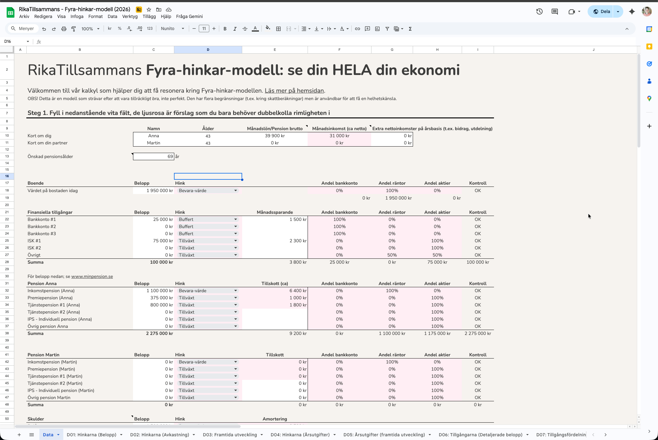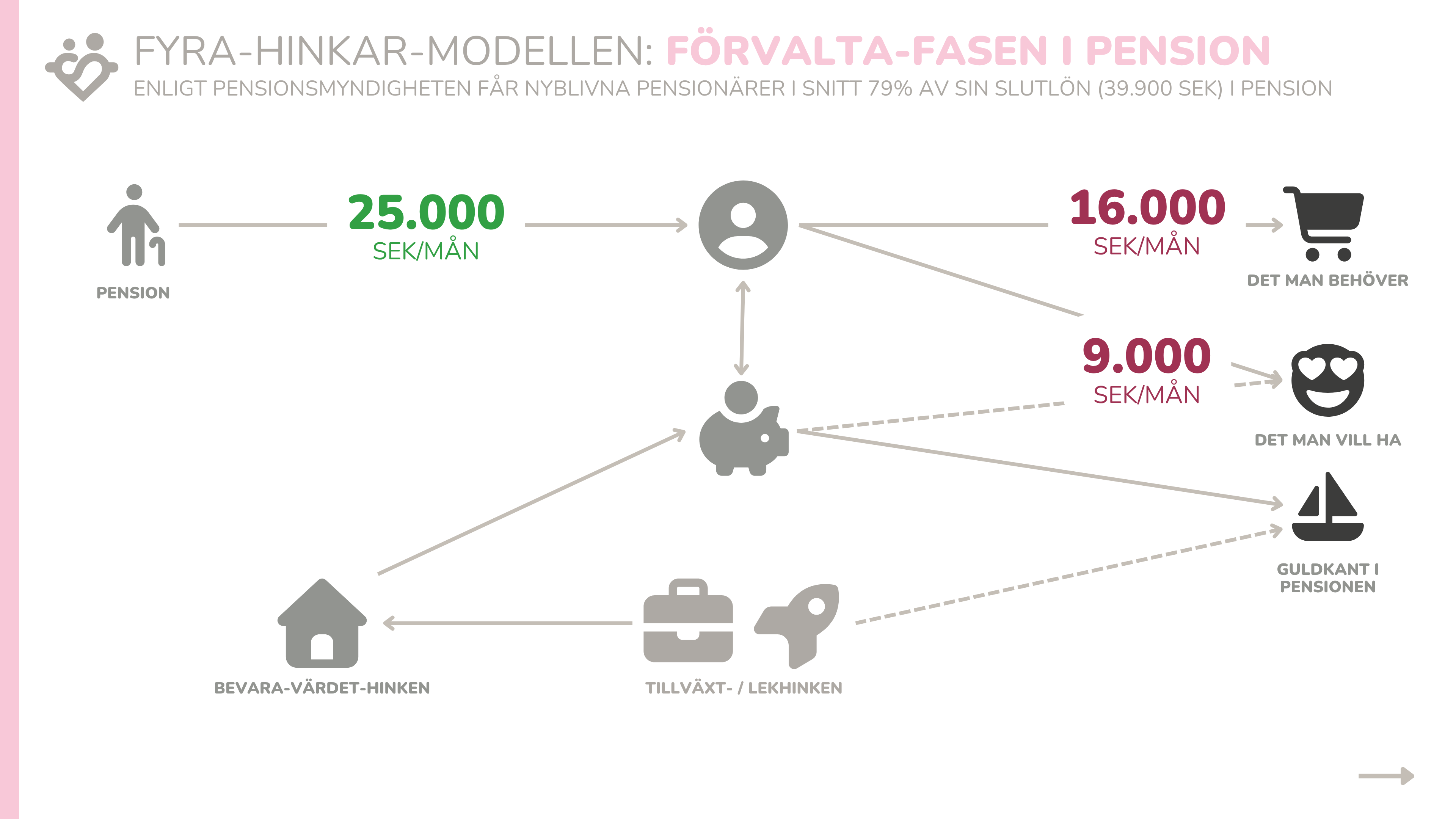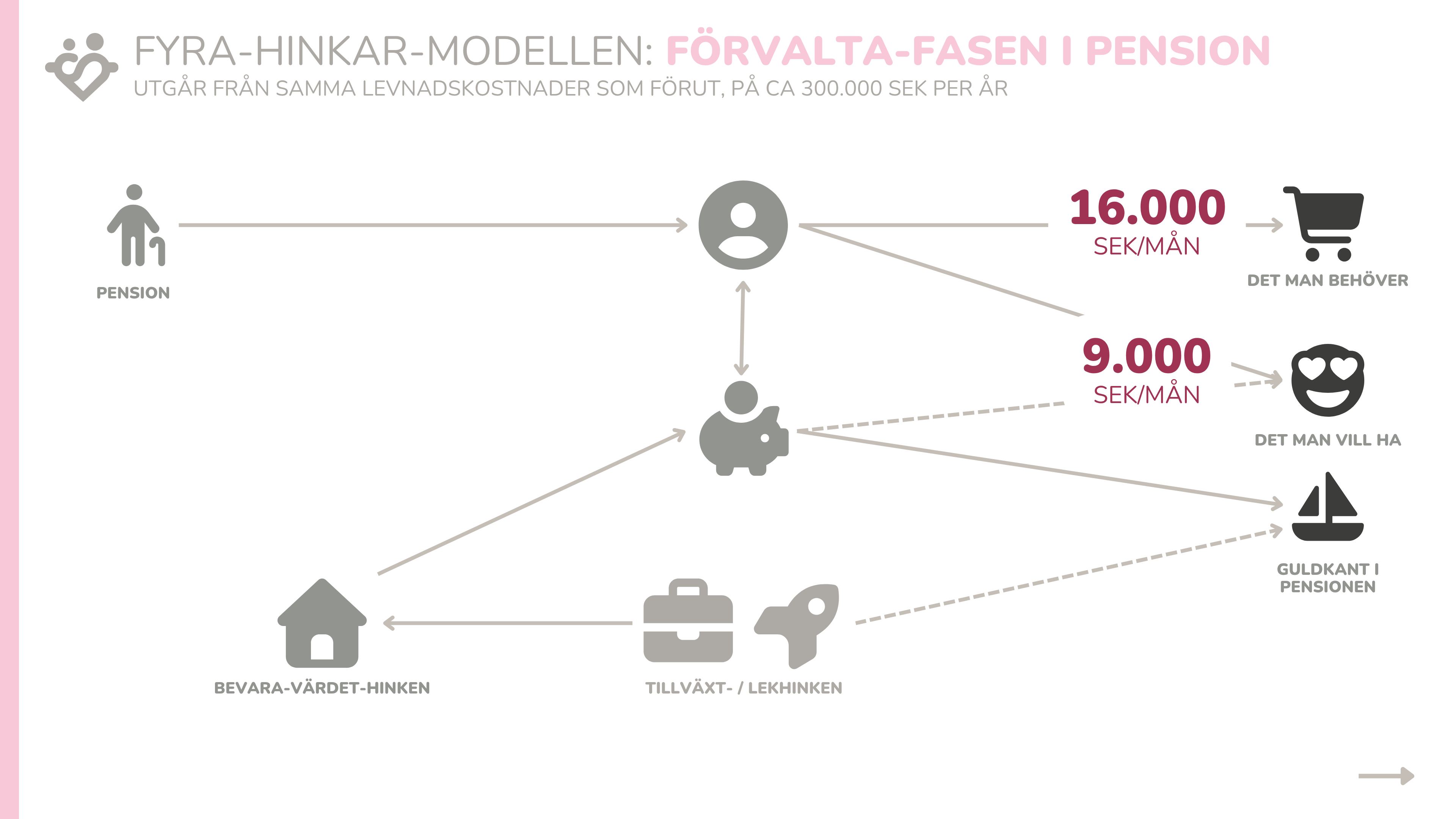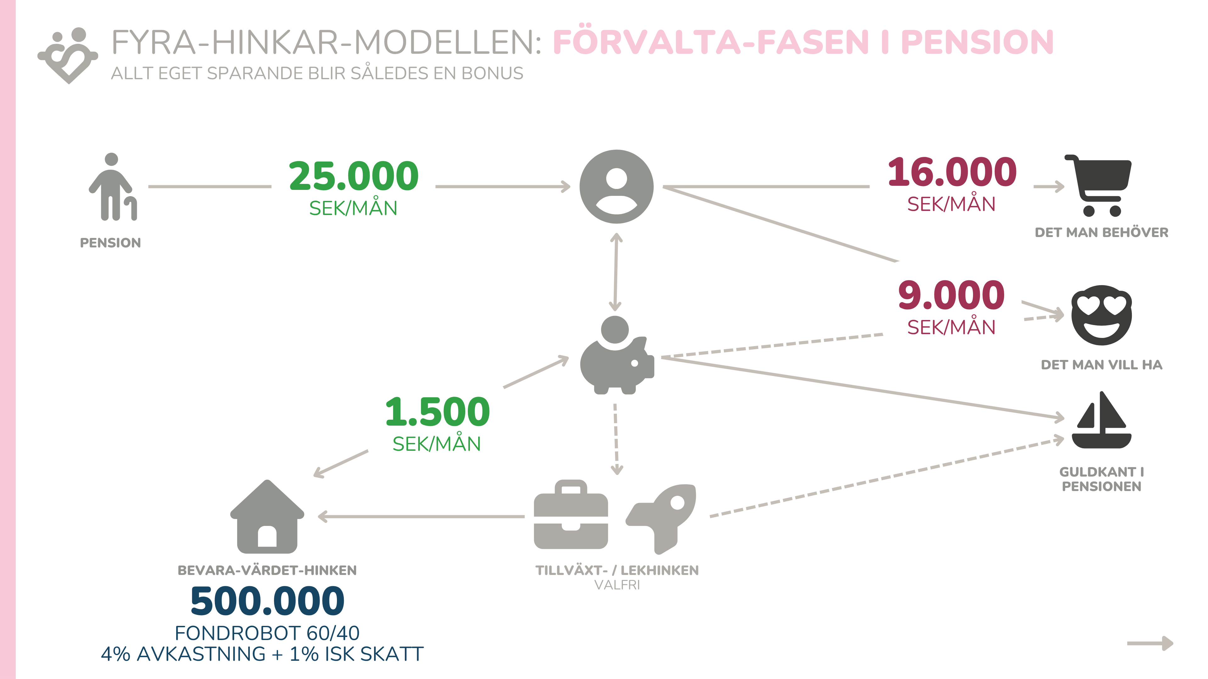 Jag tänker att vi kör igång och Karin, du får verkligen vara läsaren eller lyssnaren i avsnittet. Vi utgår från basen i fyra hinkar-modellen. Jag har inte tagit en snittsvensk, jag har tagit en snittsvensk som sparar lite mer än snittet. Men ingen multimiljardär eller mångmiljonär.