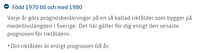 - Först bör du fundera över din pensionsålder. Din riktålder för pension är 68. Senare ger mer pension. Du kan även få den mycket förmånligare skatten på pensionen först från kalenderåret du fyller 69 ( kan ge härad +3000 per månad extra du slipper skatta bort av pensionstillgångarna i ditt fall) .