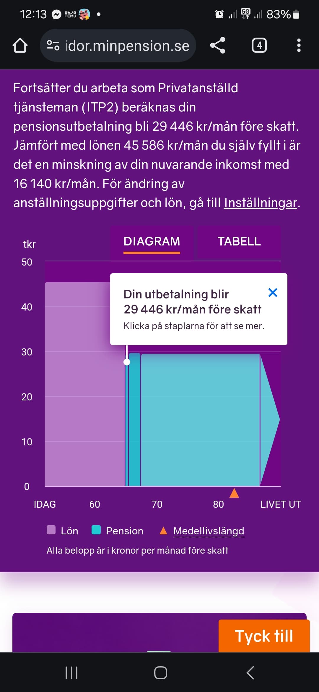 @Tobiass Använd ”planeraren” i minpension.se och i stället för att ange livslånga pensioner, variera olika uttagstider för pensionerna. Du kan även se vad som händer med pensionspengarna vid i- eller urkryssande av efterlevandeskydd. Kombinera med den utmärkta ”Uttagskalkylator Delux” på Sparkalkylator - Deluxe ~ z2036 (tryck på dom gröna cirklarna för att få fler möjligheter till anpassningar, för fondavgift, gissad framtida inflation, ökande månadsparande etc). Ta dig sen en funderare på antaganden och gissningar för din nuvarande och framtida situation. På ca 15-20 år kan du nog skramla ihop en del pengar på ISK för att kunna få ett OK månadsbelopp att ta av framöver. Inga tips för ökad pensionspeng direkt men kan ge en övergripande bild om vad som behövs / inte behövs för ett dräglig liv senare, utöver att knega på i grottekvarnen just nu och försöka höja lönen.