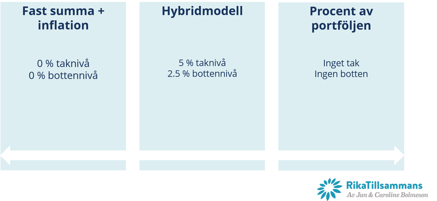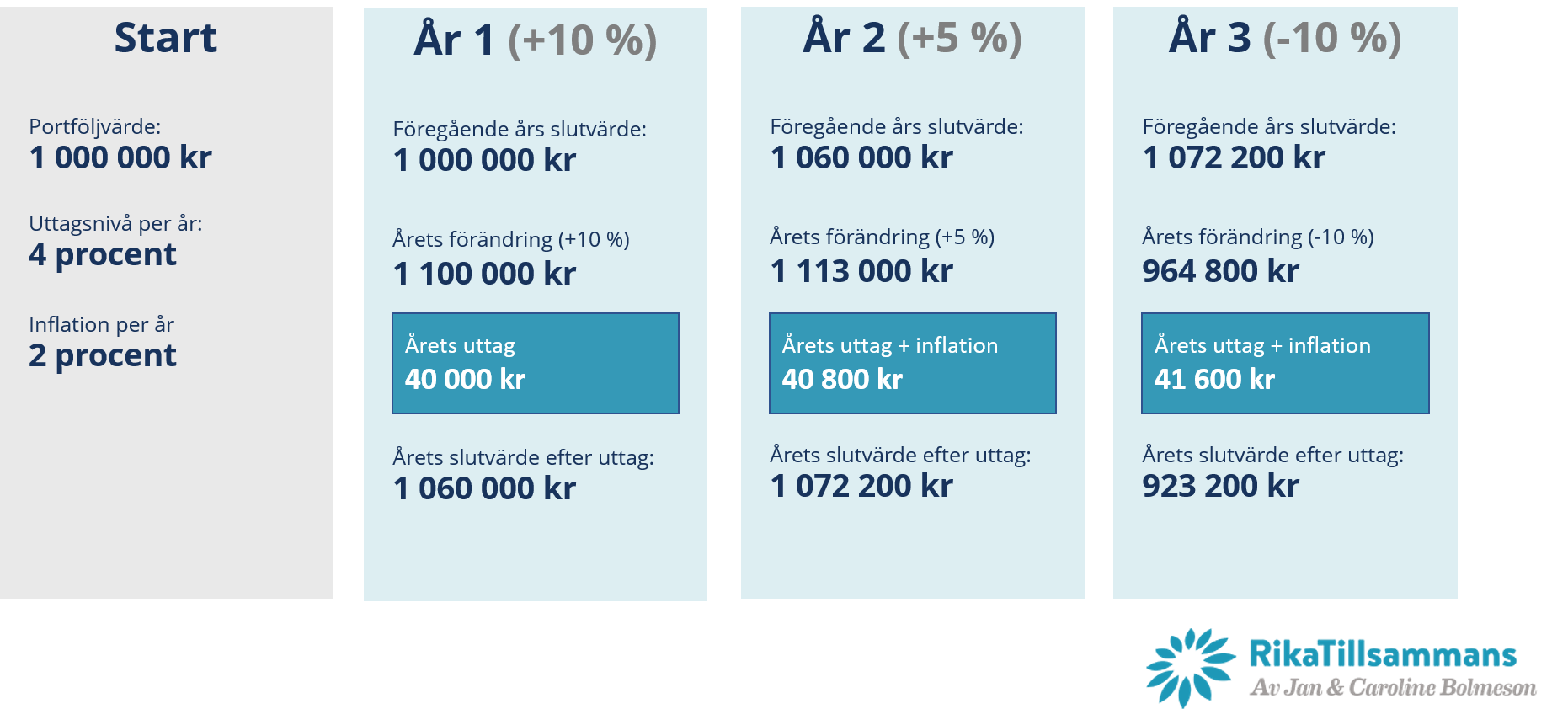 Fast summa + inflation | Räkna ut ett belopp första året, korrigera för inflation på årsbasis | Ignorerar marknadens utveckling, ger stabilitet i uttag på kort sikt, den långsiktiga effekten är oförutsägbar |