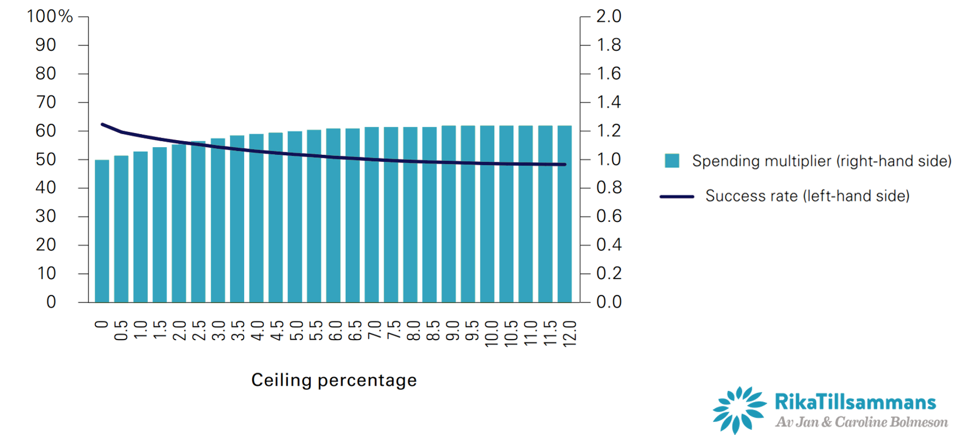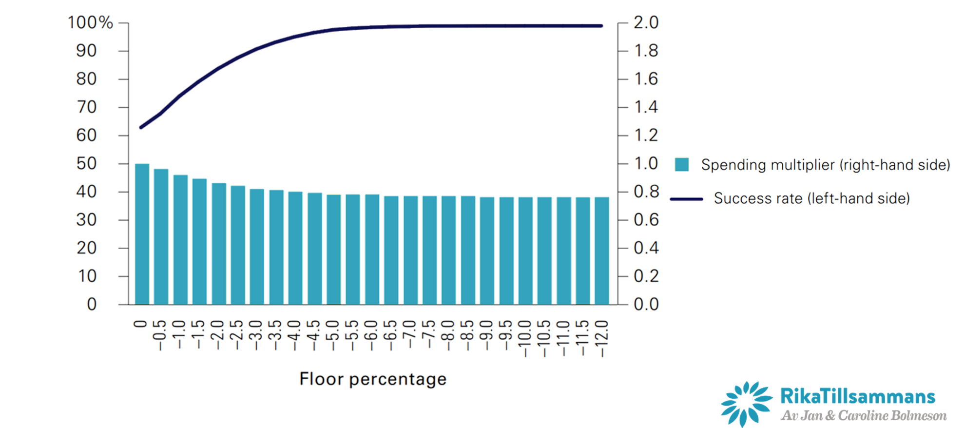 Nedanstående två grafer visar däremot hur successrate förändras i förhållande till olika golv och tak. Den första bilden visar resultatet då taket fixeras vid 0 % och sedan låter man golvet förändras mellan 0 till -12 %. Den vänstra axeln och linjen visar success rate och den högra axeln visar uttagsmultiplikatorn per år.