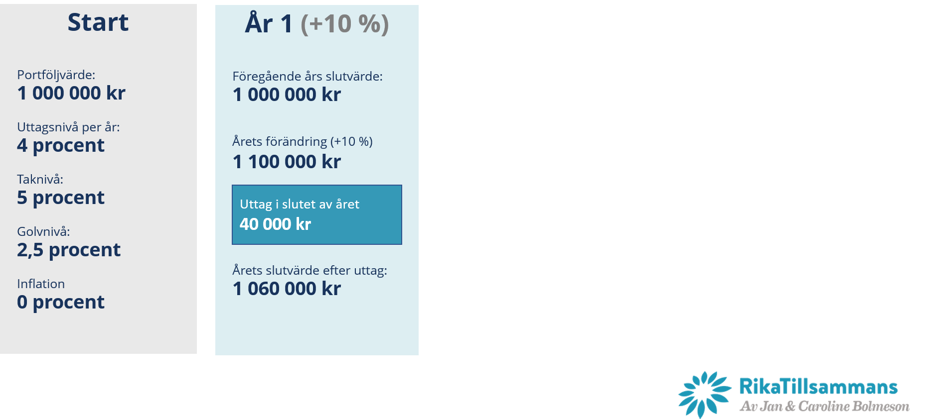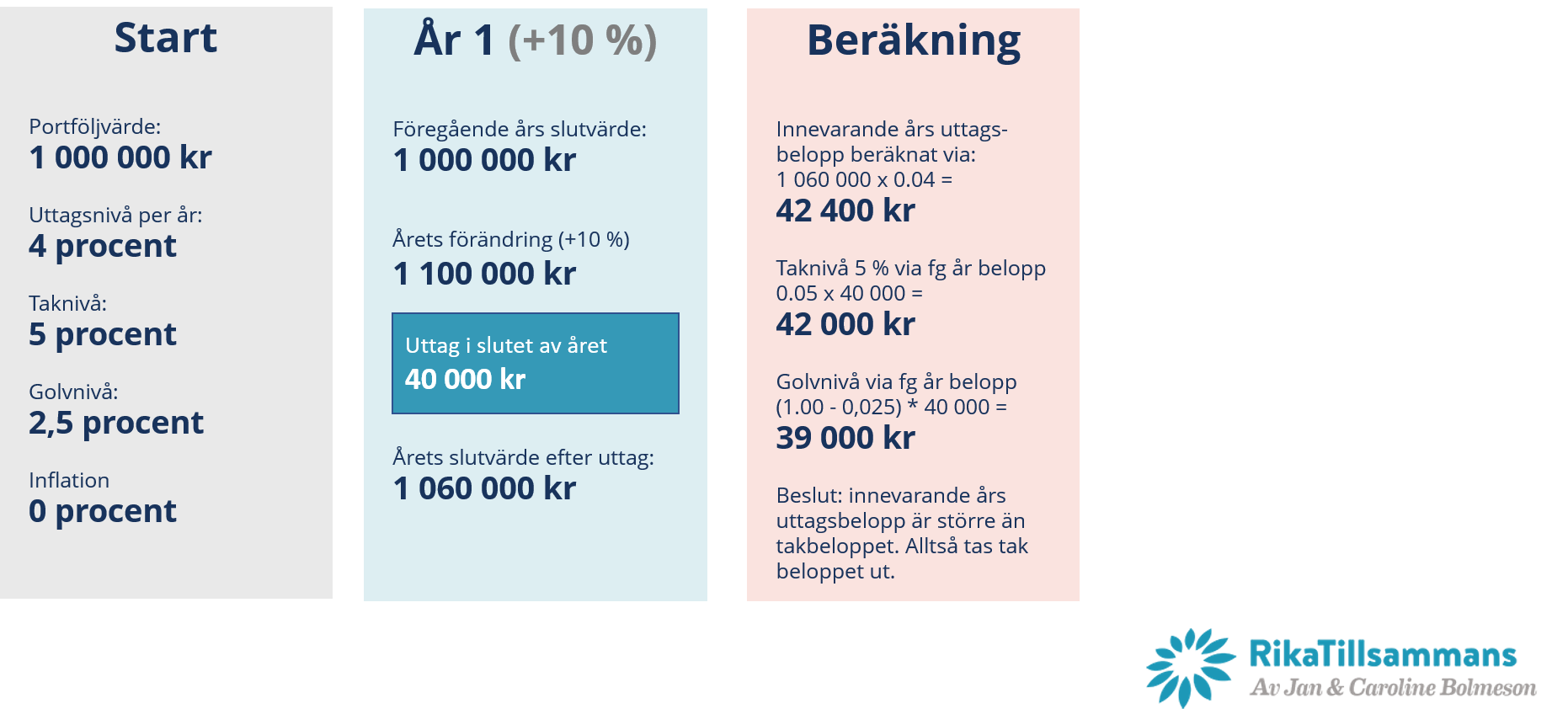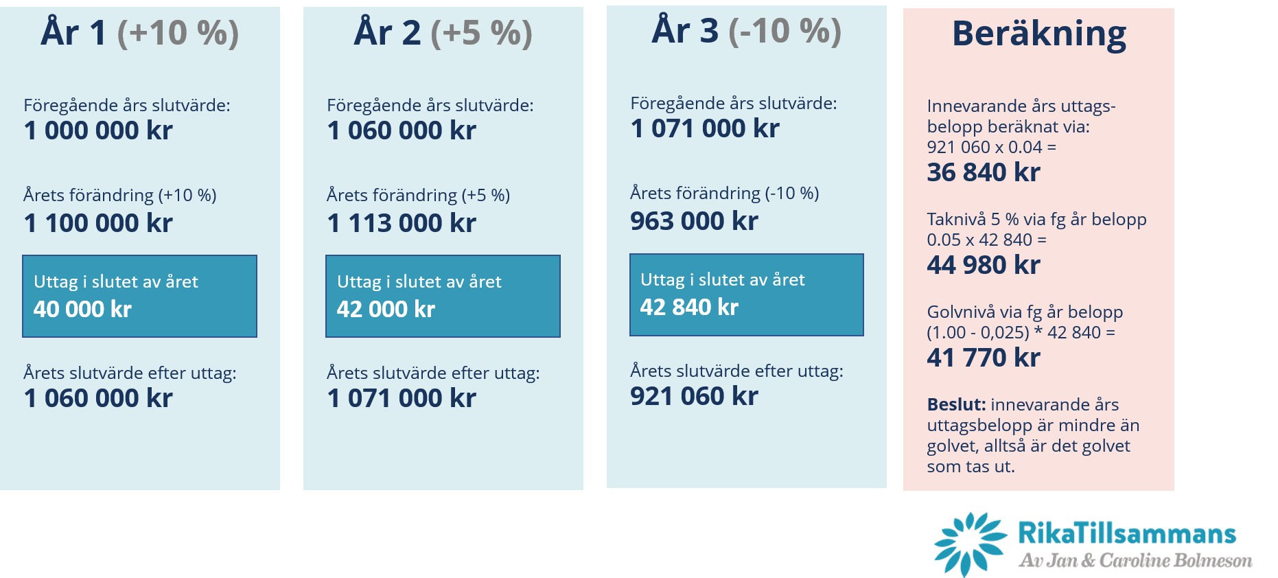 - Golvbelopp – jag räknar ner föregående års uttagsbelopp med min procentsats för uttagsnivån.