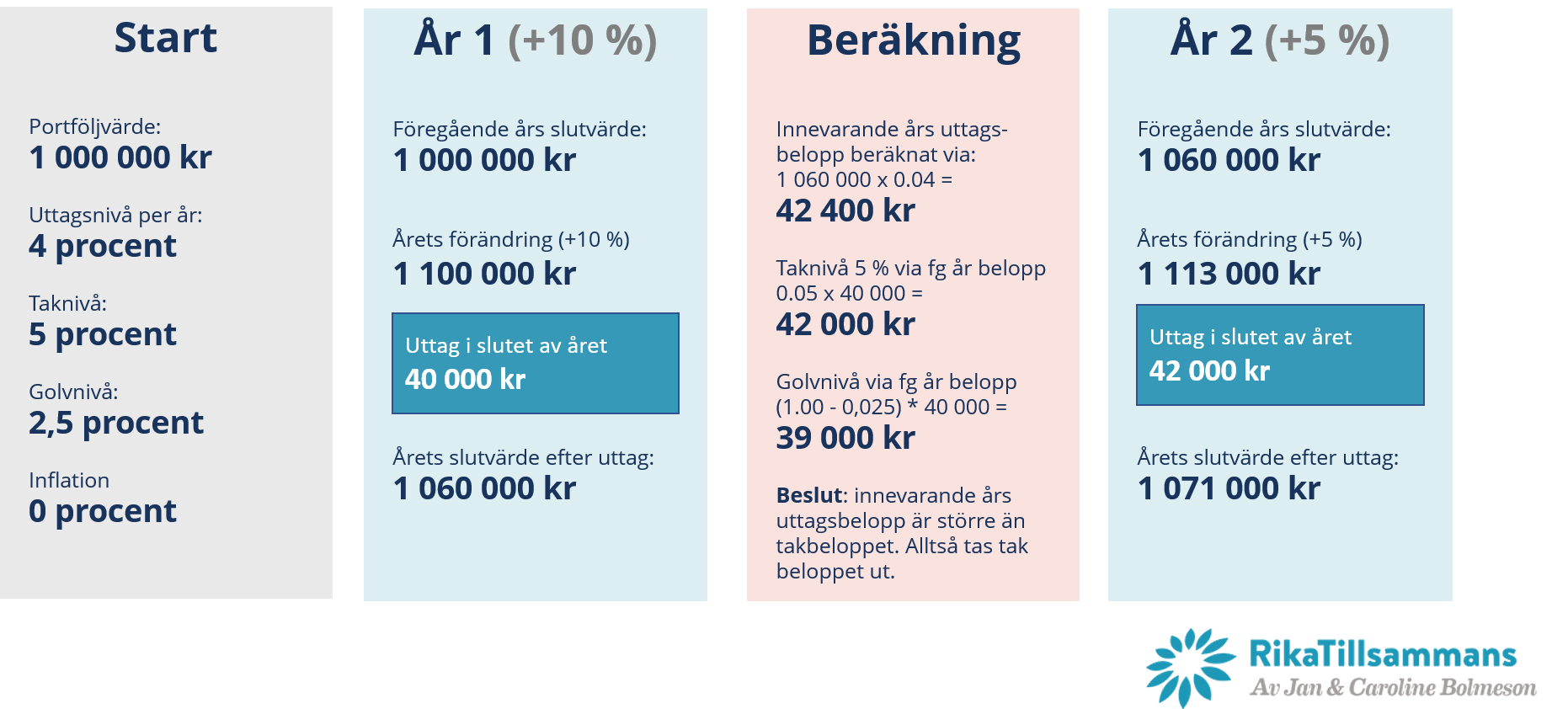 Vi räknar ut uttagsbeloppet baserat på föregående års slutvärde (1 060 000 kr), medan vi räknar ut tak och golvnivån baserat på föregående års uttagsbelopp (40 000 kr). Eftersom uttagsbeloppet (42 400 kr) är större än takbeloppet (42 000 kr), tas endast takbeloppet ut. Nästa steg blir således: