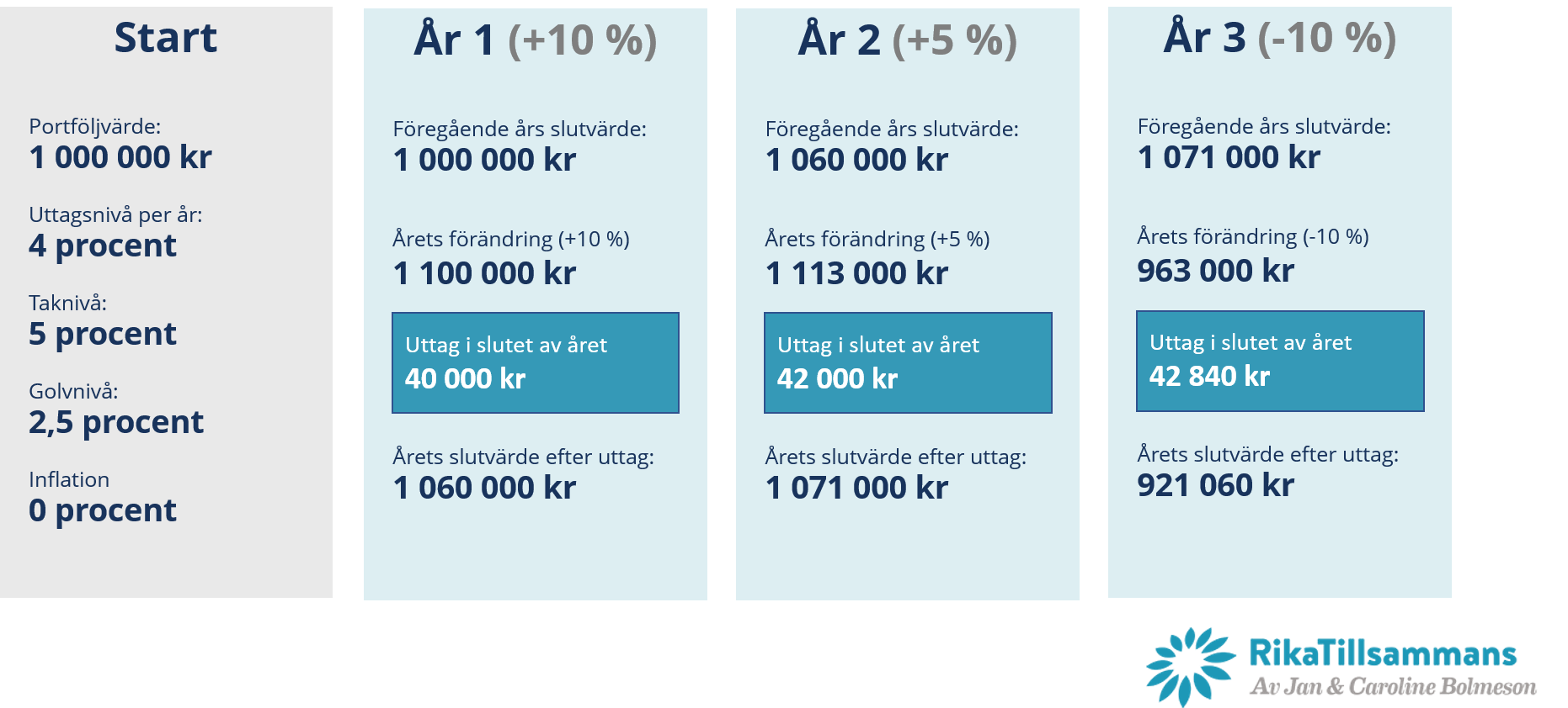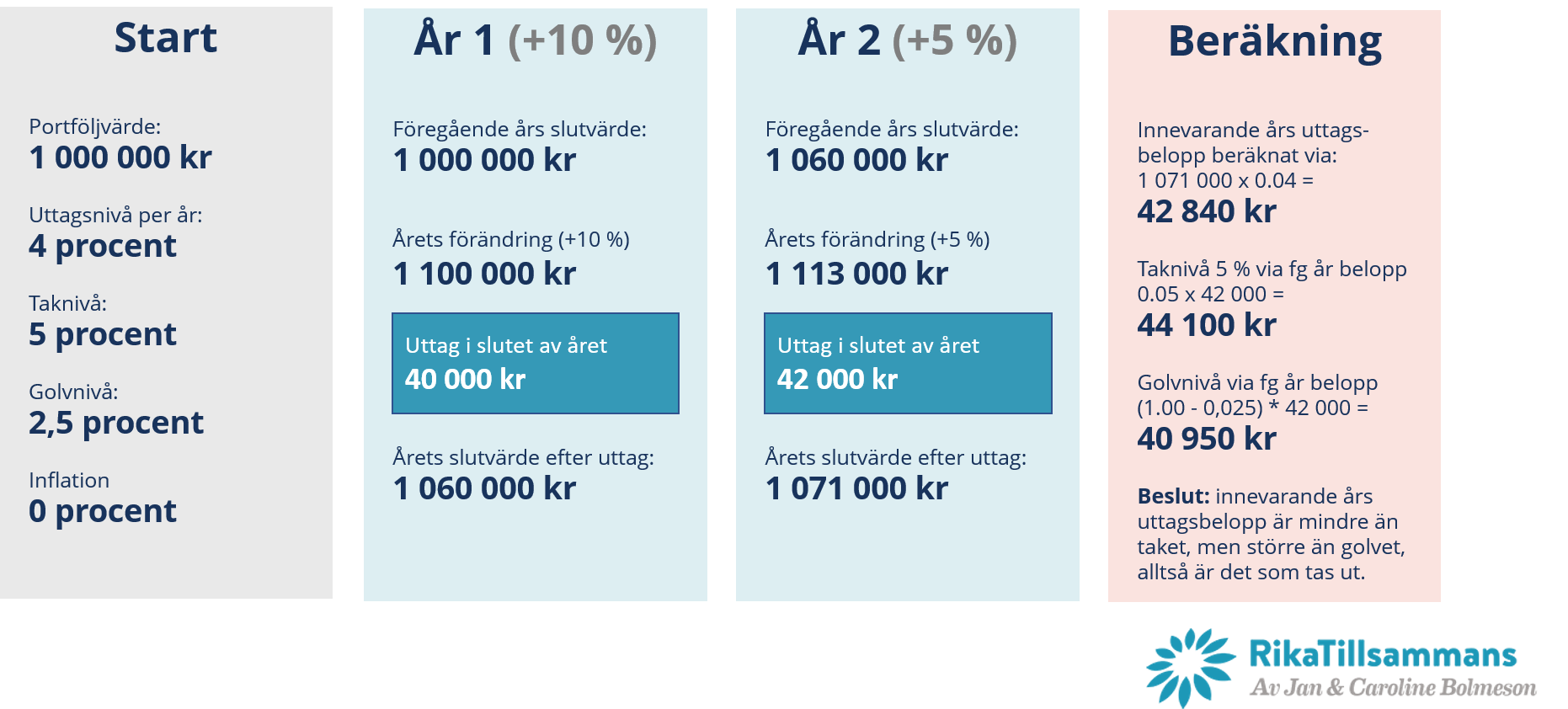 Jag hoppas att det går att hänga med i beräkningarna ovan och att du ser hur golvet och taket skapar ett intervall i vilket uttagsbeloppet hamnar. I dåliga tider gör golvet att du kan ta ut mer pengar än du egentligen borde och i goda tider hjälper den dig att ta ut lite mindre än du egentligen skulle kunna. På det sättet får du både en lagom stabilitet och en lagom utveckling i portföljen.