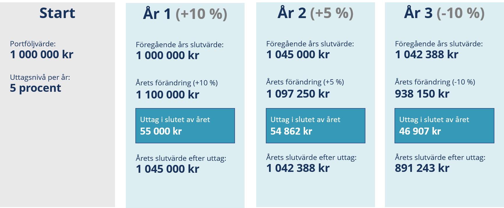 Alla dessa faktorer kommer påverka beloppet som man kommer att behöva ta ut från sitt kapital. Ju bättre uppskattning man kan göra, desto säkrare kommer man kunna göra sin uttagsstrategi.