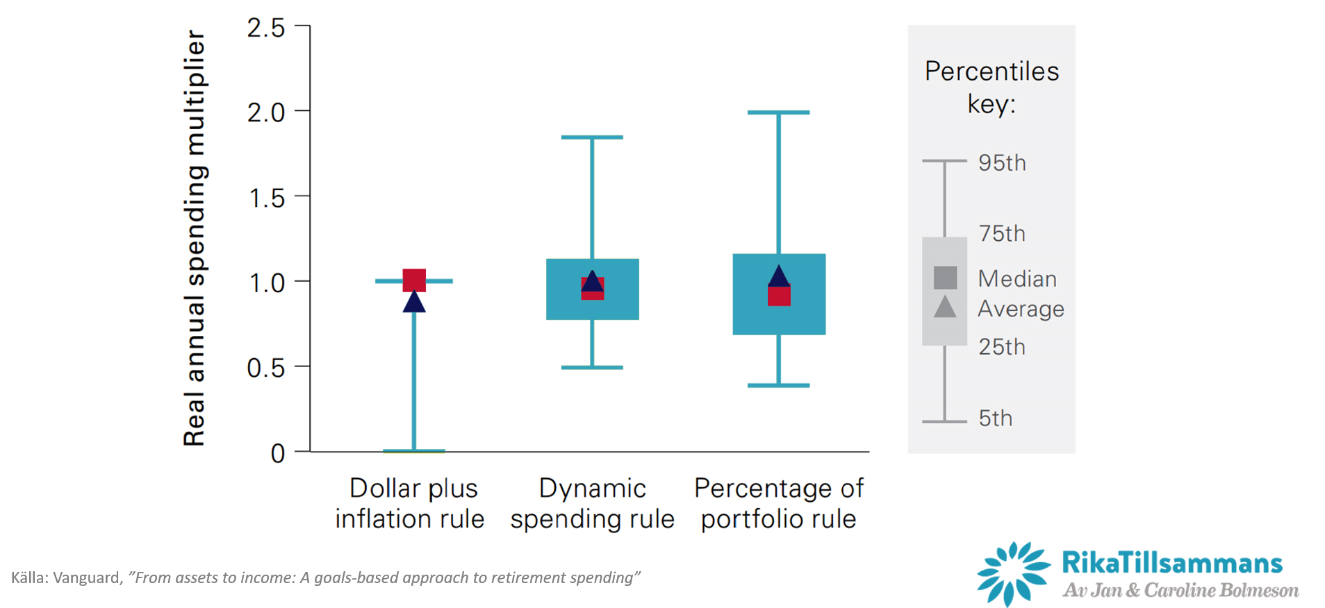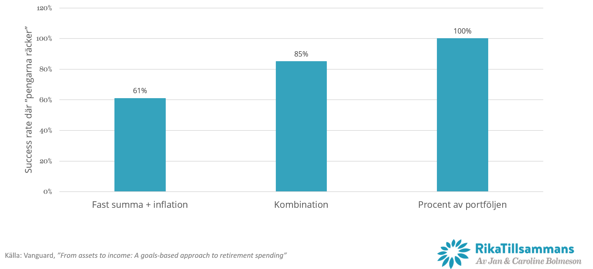 Vanguard räknade fram i sin artikel att 2.5 på golvet och 5.0 på taket var ganska lämpligt eftersom det gav en 85 procentig successrate över en 35 års period. Det vill säga att att om jag är 65 år gammal, går i pension, så kan jag med 85 procent sannolikhet utgå från att pengarna kommer att räcka vid ett uttag om 5 procent per år.