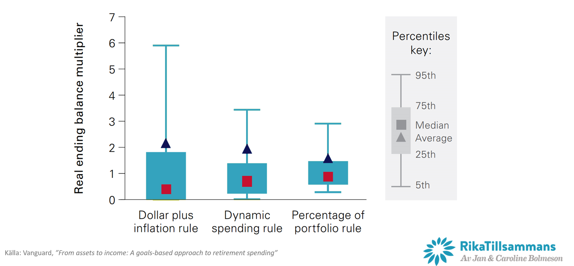 Något som också är intressant är hur den aggressiva portföljen inte nödvändigtvis tillåter de högsta uttagen. Men i grunden så är slutsatsen att det handlar om att göra en avvägning mellan stabilitet i uttagen och flexibiliteten i tak och golv-modellen. Det här leder också till behovet av att ha en bra förståelse för sina andra inkomster och utgifter. Om jag t.ex. vet att jag kan klara majoriteten av mina utgifter med garanterade inkomster, t.ex. pension, så kan man unna sig en högre flexibilitet. Ju mer man kan tolerera kortsiktiga svängningar, desto högre sannolikhet har man för att lyckas med sina långsiktiga mål.