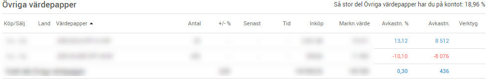 Ett annat vanligt misstag i sammanhanget är att fokusera på den investering som har gått ner när andra har gått upp. Den här brukar vara ganska tydlig, man loggar in på sin depå, de flesta siffrorna är gröna eller blåa men sedan finns de där röda raderna. Det här är t.ex. en del av min portfölj just nu: