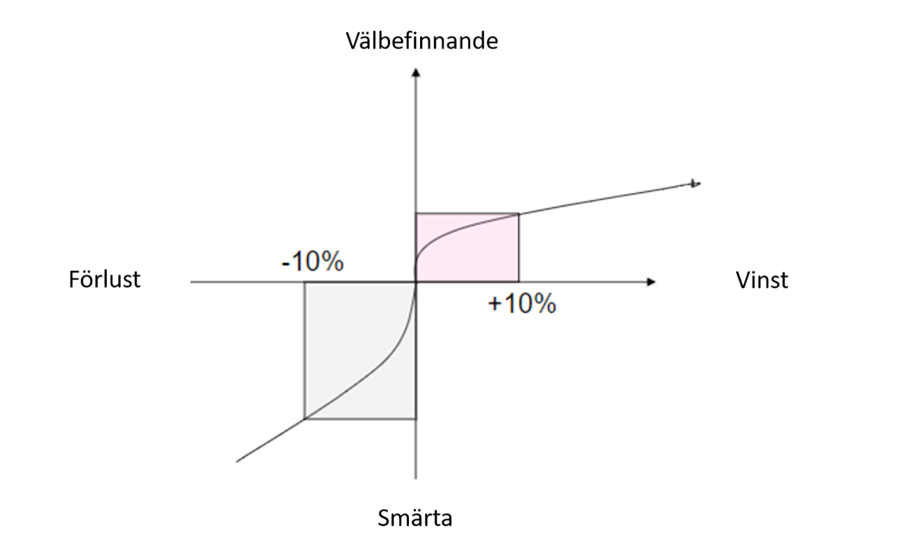 Det första misstaget som de absolut flesta av oss gör är att vi värderar vinst och förlust olika. Eller rättare sagt handlar det om att vi värderar känslan och upplevelsen av en vinst och förlust olika. Känslan av en förlust av 10 000 kr är värre än känslan av en vinst på 10 000 kr. Det är till och med som så att känslan av en kommande vinst är mer tillfredsställande än själva vinsten (om den kommer). Studier har visat att vi många gånger värderar en förlust uppemot 2.5 gånger värre än en vinst. Det är det som har gett upphov till följande klassiska graf: