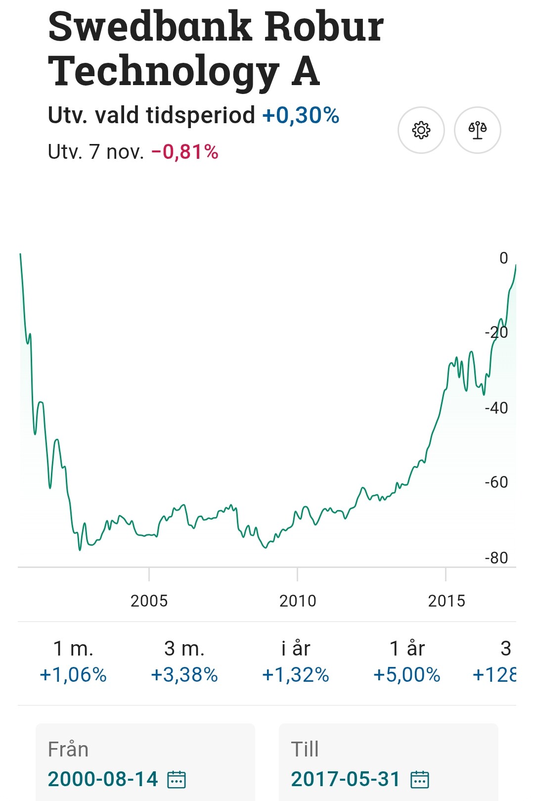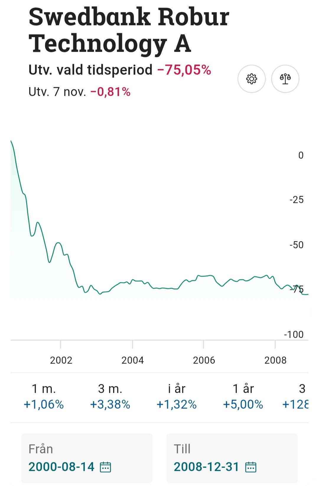 Titta på graferna här. Första visar att fonden fortfarande var ner 75% efter drygt 8 år. Som värst 79%.