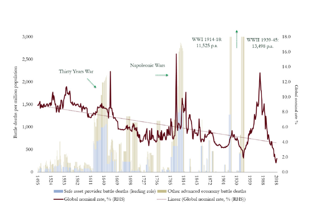 the long-term historical data suggests that, whatever the ultimate driver, or combination of drivers, the forces responsible have been indifferent to monetary or political regimes; they have kept exercising their pull on interest rate levels irrespective of the existence of central banks, (de jure) usury laws, or permanently higher public expenditures. They persisted in what amounted to early modern patrician plutocracies, as well as in modern democratic environments, in periods of low-level feudal Condottieri battles, and in those of professional, mechanized mass warfare.