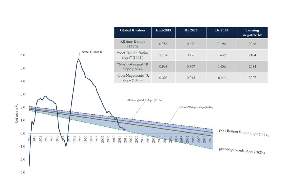 But the value of constructing the first multi-century, high-frequency GDP-weighted real rate dataset for both the global “safe asset provider”, and advanced economies on aggregate goes beyond purely empirical qualifications. In its applied dimension, I sought to suggest that a long-term reconstruction of real rate developments points towards key revisions concerning at least two major current debates directly based on – or deriving from – the narrative about long-term capital returns. First, my new data showed that long-term real rates – be it in the form of private debt, non-marketable loans, or the global sovereign “safe asset” – should always have been expected to hit “zero bounds” around the time of the late 20th and early 21st century, if put into long-term historical context. In fact, a meaningful – and growing – level of long-term real rates should have been expected to record negative levels.
