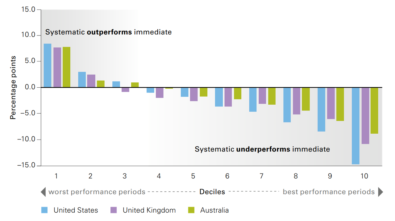I sin studie från 2016 redovisade Vanguard följande graf. Den visar vilken strategi som varit bäst för de olika länderna om man sorterat perioderna efter utfall i deciler. I den första decilen har man alltså valt de 10 % sämsta utfallen. I nästa decil hamnar utfallen som hamnade i intervallet 11 – 20 och så vidare.