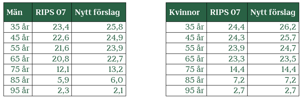 Mallen är nu i sin 3:e version. Inga upptäckta fel som krävt ändringar som ställer alla uträkningar på ända än så länge som väl är. Mest behov av förtydliganden och förklaringar. Detta inkluderar nu möjligheten att laborera med IBB och PBB samt förklaring kring livslängdsantaganden och tillägg av en flik med ett par tabeller över det för respektive åldersgrupp. KPAs eget förslag finns med och ser ut så här: