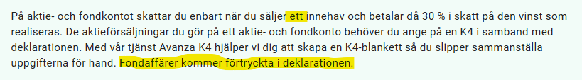 Om jag gör ett köp i en AF och köper en aktiefond. Vad är det skatteverket får för info? Dom borde väl få mitt NAV och antal fondandelar men om jag säljer 4% årligen så borde det väl inte innebära som ovan dvs “ett” innehav eller “ditt innehav”. Får skatteverket direkt info vad NAVet är vid försäljningen eller är det som med aktier att man skriver själv vad man sålt för aktierna för?