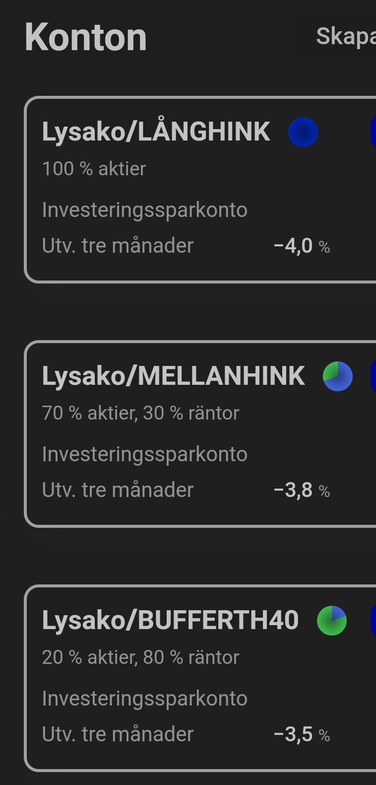Nedan bild visar tremånadsutvecklingen på mina tre hinkar på Lysa. De baseras på 100%aktier, 70%aktier&30%räntor respektive 20%aktier&80%räntor.