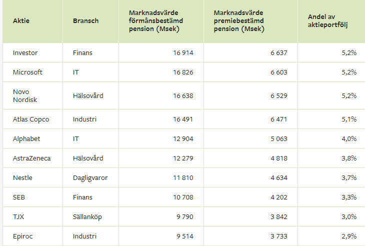 Om man nu ska ta högre risk än ett globalt index, tala för sin förmåga att aktiv förvaltning är bättre är det väl rimligt att man som pensionssparare faktiskt får effekt av detta i form av ökad avkastning? Här nedan kan du se deras största innehav - rimlig riskspridning?
