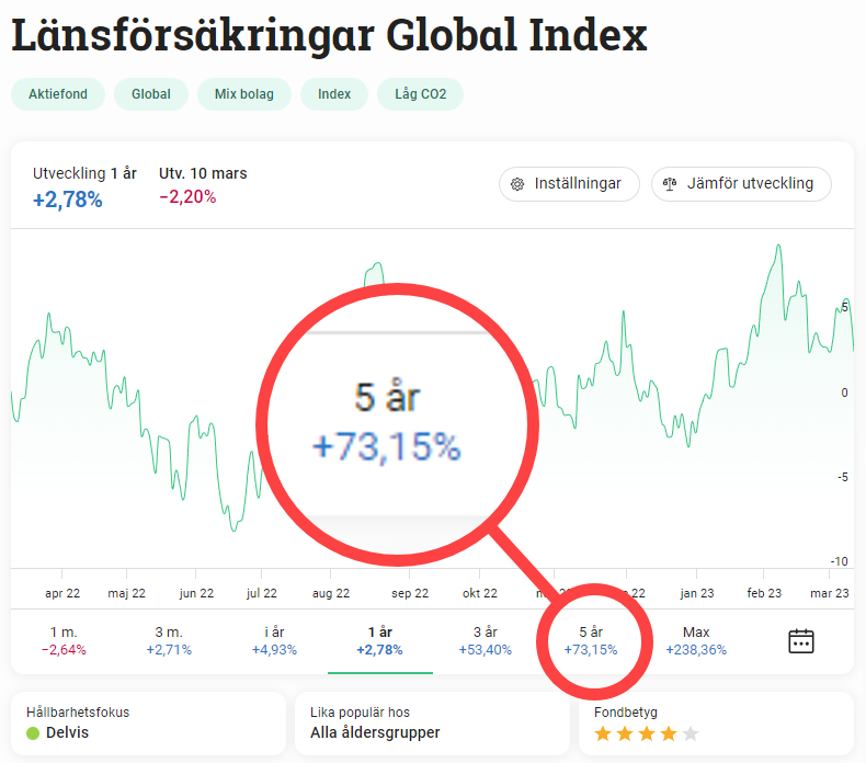 Vår favoritfond indexfond som vi tipsat om de senaste åren är Länsförsäkringar Global Index. Det är samma fond som vi gjorde ett 5-års vad med en annan aktiv förvaltare kring 2018, så ingen kan anklaga oss för cherry-picking. Enligt Avanza har den de senaste fem åren avkastat 73.15 %. Räknar vi om det till en årsmedelavkastning (via CAGR) så blir det…