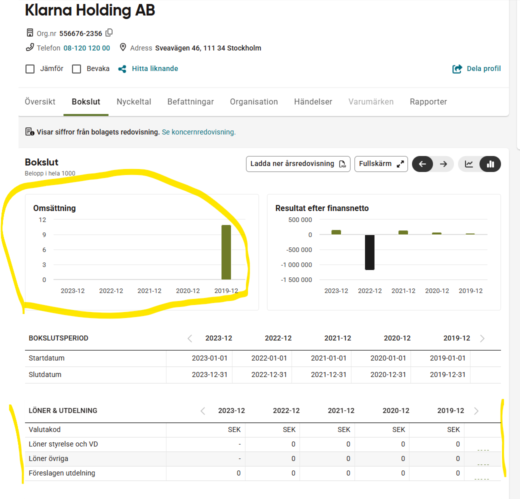 Du länkar till Klarna Bank AB, men har screenshot för Klarna Holding AB, att det är 0 omsättning i ett holdingbolag är normalt.