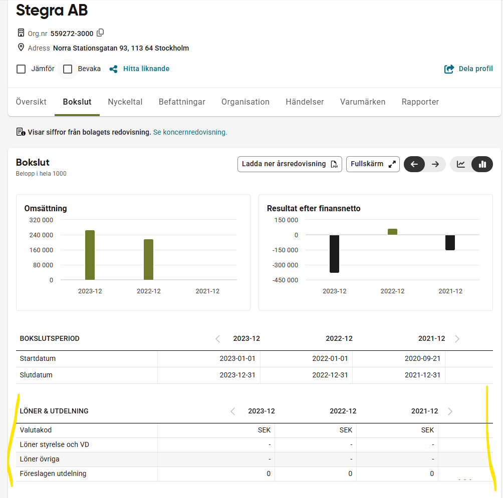 För att uppskatta lönerna själv så kan du kolla fältet Personalkostnader per anställd (under fliken Nyckeltal, eller genom att ladda ner årsredovisningen och läsa själv däri), tänk dock på att Personalkostnader även inkluderar arbetsgivaravgifter, semesterlön, tjänstepension, och vissa förmåner, så man behöver räkna lite själv för att ta fram genomsnittlig årslön (om man delar med 1,4 brukar man hamna ganska nära i de flesta bolag), just i Stegras fall blev det fortfarande väldigt högt så kan vara så att de har några väldigt avlönade personer som drar upp snittet, alternativt nåt upplägg med extra förmåner/extra tjänstepension eller liknande som förändrar från normala beräkningar.