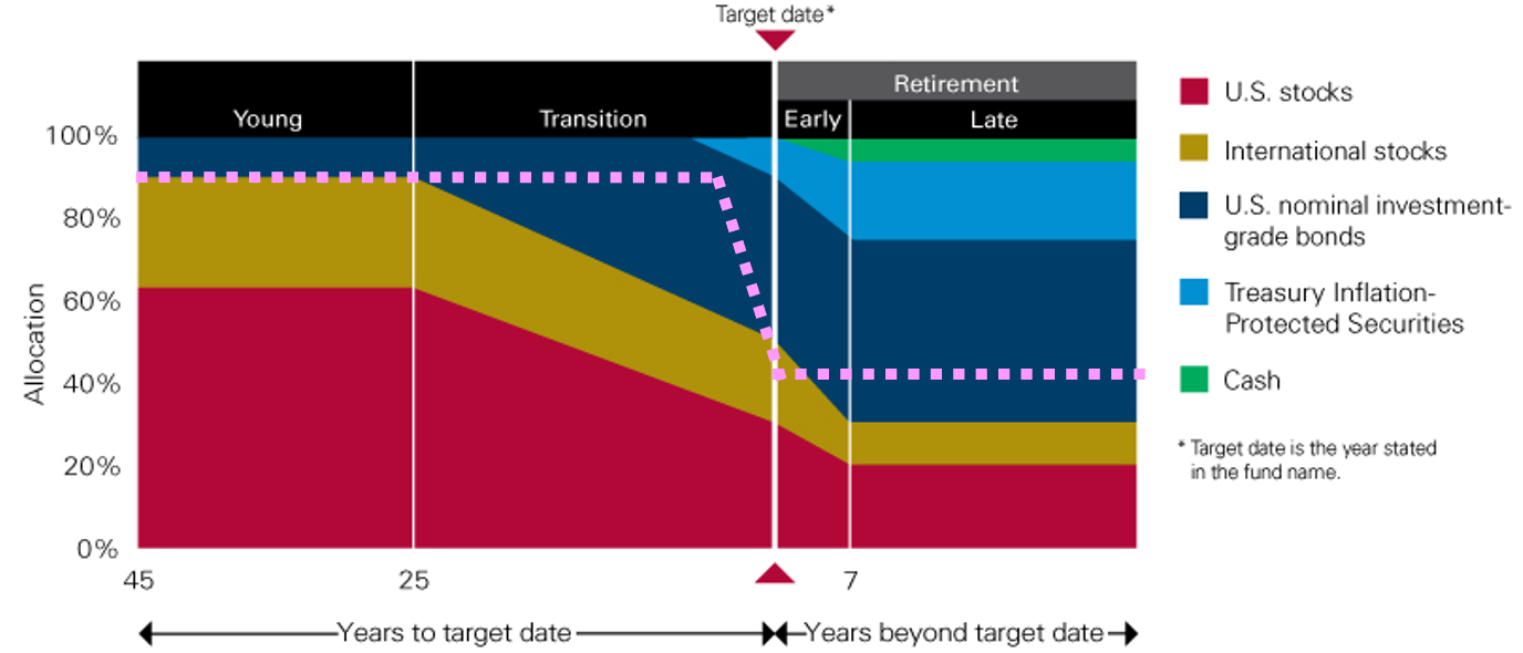 Uppenbart ger det en stor skillnad i aktieandel jämfört med Vanguard TRF (som jag också har rätt stort förtroende för). I snitt 15-20% högre aktieandel redan från 25 år före Pension/FIRE till man “går” och därefter drygt 10% högre aktieandel från Pension/Fire året och tills man dör, eller pengarna tagit slut (hepp).