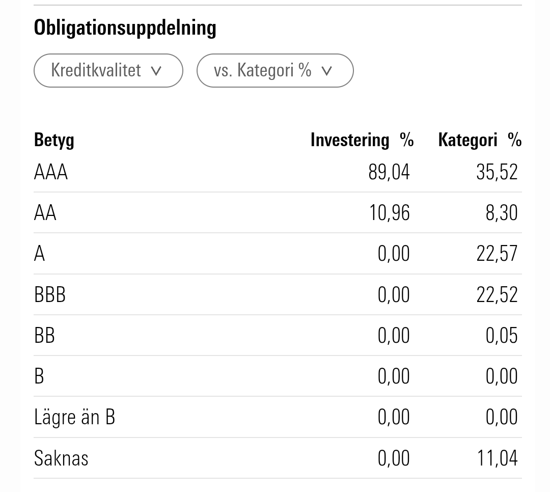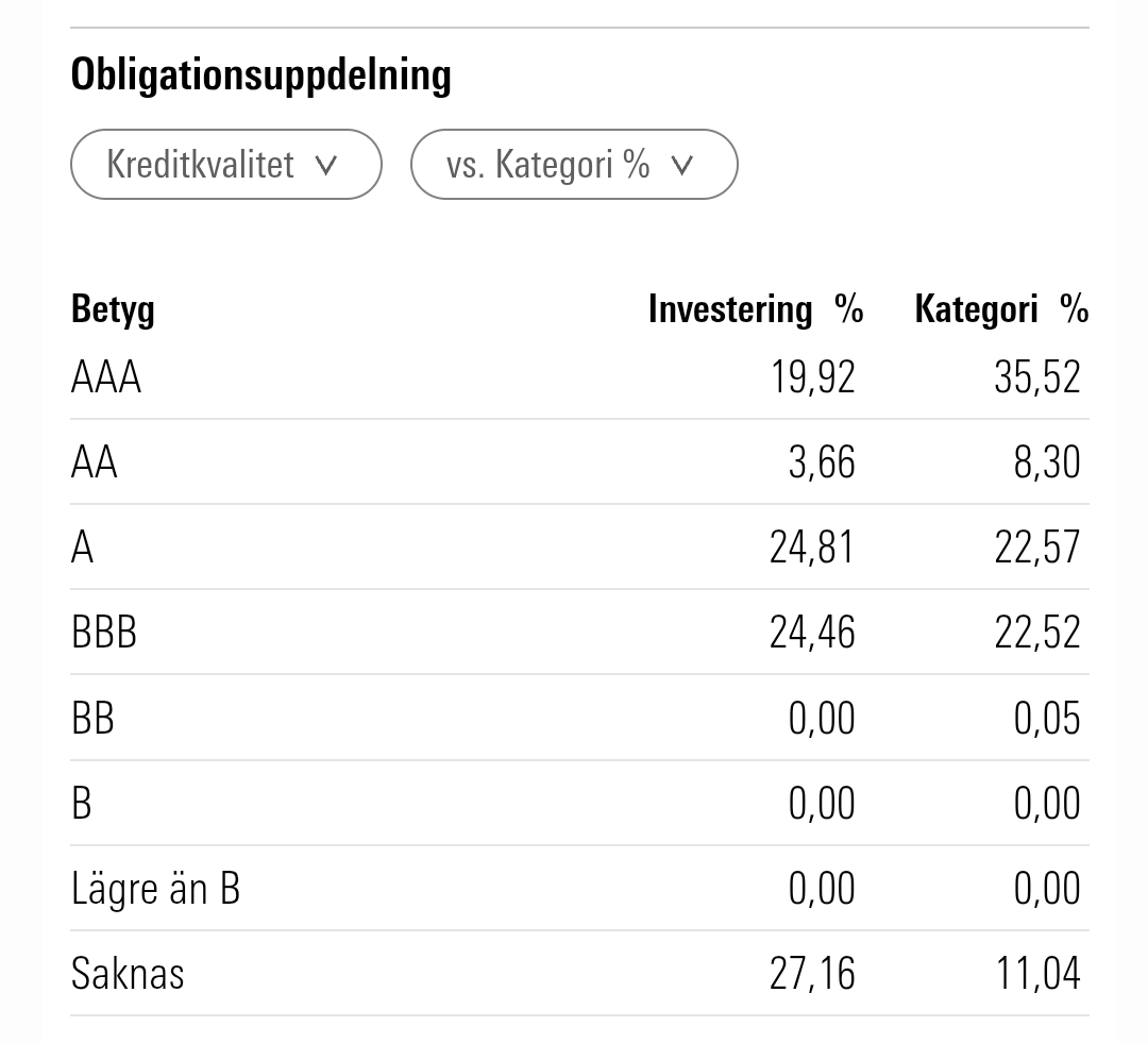 Tittar vi på innehavens kredikvalitet i AMF Kort på Morningstar ser de ut så här: