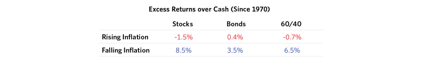 Här är avkastningen för en klassisk 60/40-portfölj i stigande vs fallande inflation