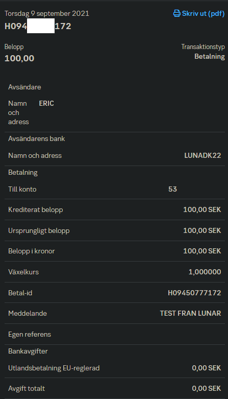 Kan rapportera att åtminstone mellan Lunar och SEB så går det som en EU-betalning utan avgift och SEK till SEK. Se nedanstående bild.