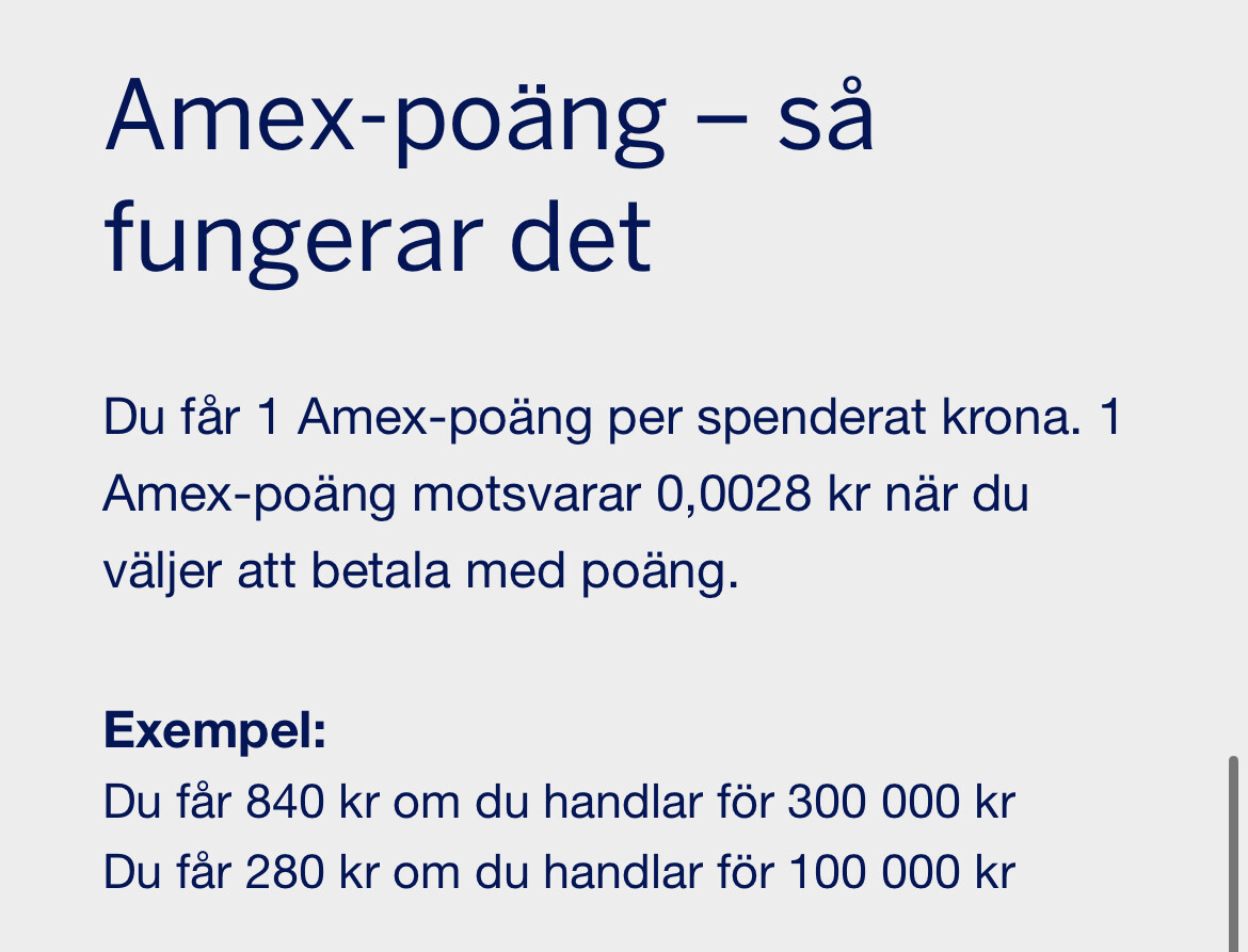Amex poäng är ju totalt värdelöst iaf om du vill spendera dom som pengar… Spelar ingen roll vilket amex kort du har…