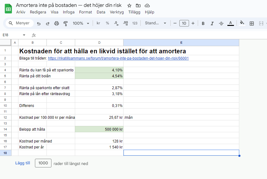 Kostnaden för möjlighetsutrymmet (“optionskostnaden”) är 26 kr/mån per 100.000 kr i lån. På en halv miljon så blir nettokostnaden 128 kr/mån eller 1540 kr/år. Det tycker jag är en fullt rimlig och hanterbar kostnad.