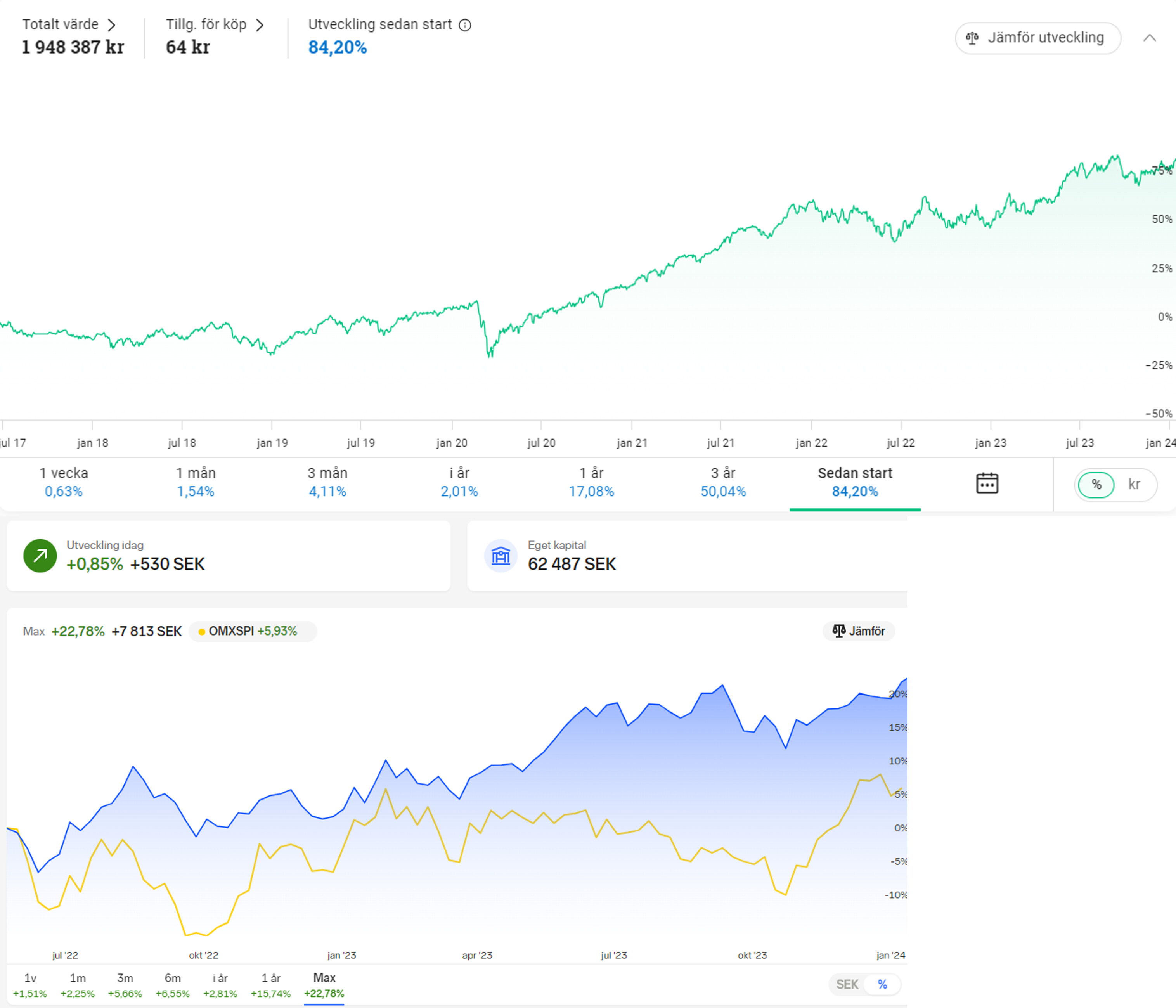 Nej du har rätt Erik, man får räkna på vad portföljen avkastat i procent under hela tidsperioden. Att dividera vinst/insatt kapital blir helt meningslöst. Säg att du tar ut hela ditt insatta kapital förutom en krona. Skulle ge rätt bra avkastning? Således inte ett bra mått på hur portföljen avkastat. Bra jobbat för övrigt. Vi ligger ganska jämsides portföljvärdemässigt och har investerat ungefär lika lång tid. Själv kör jag ca 50/50 Sverige/Global. Väldigt lätt sätt att få bra avkastning till inget jobb alls.