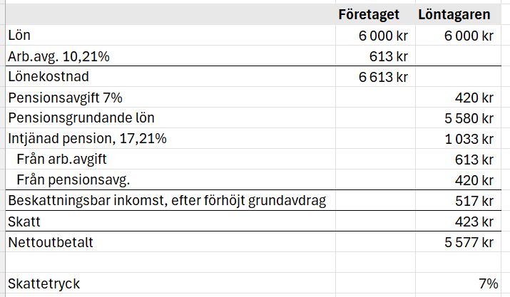 Känns som du säger väldigt fördelaktigt där jag kan anställa en pensionär (min förälder) för en billig peng där de får behålla större delen av det som utbetalas i lön till dem. Samtidigt så ökar jag mitt möjliga utdelningsutrymme och minskar min skatt på vinst (och minskar vinst givetvis).