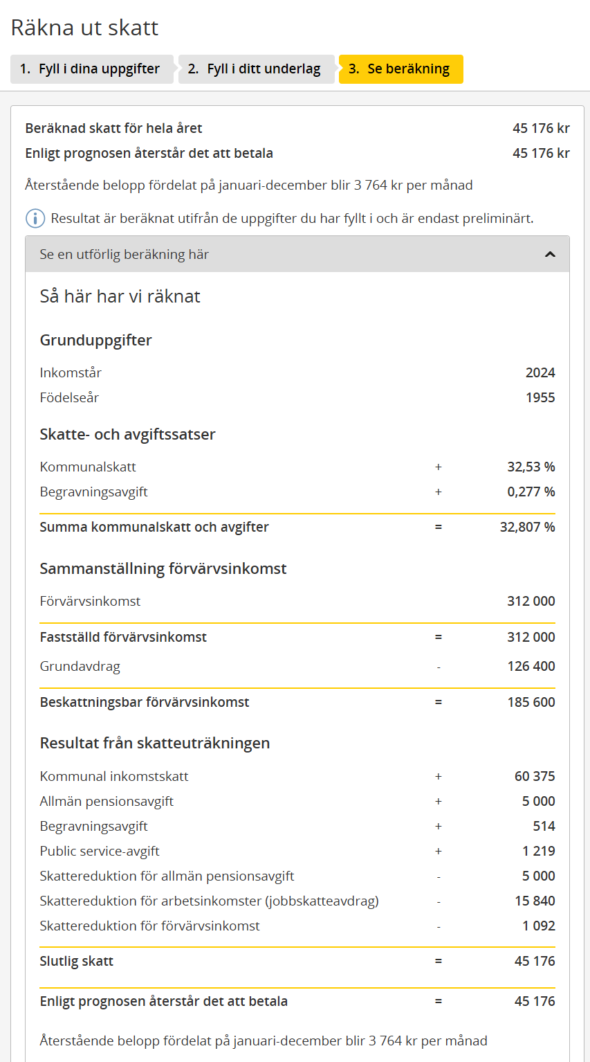 Skatten är löjligt låg när man är pensionär och har det förhöjda grundavdraget. Skatten är ca 8% på löneinkomster upp till 300 tusen. Bifogar skatteuträkningen från Skatteverket på helårsbasis.