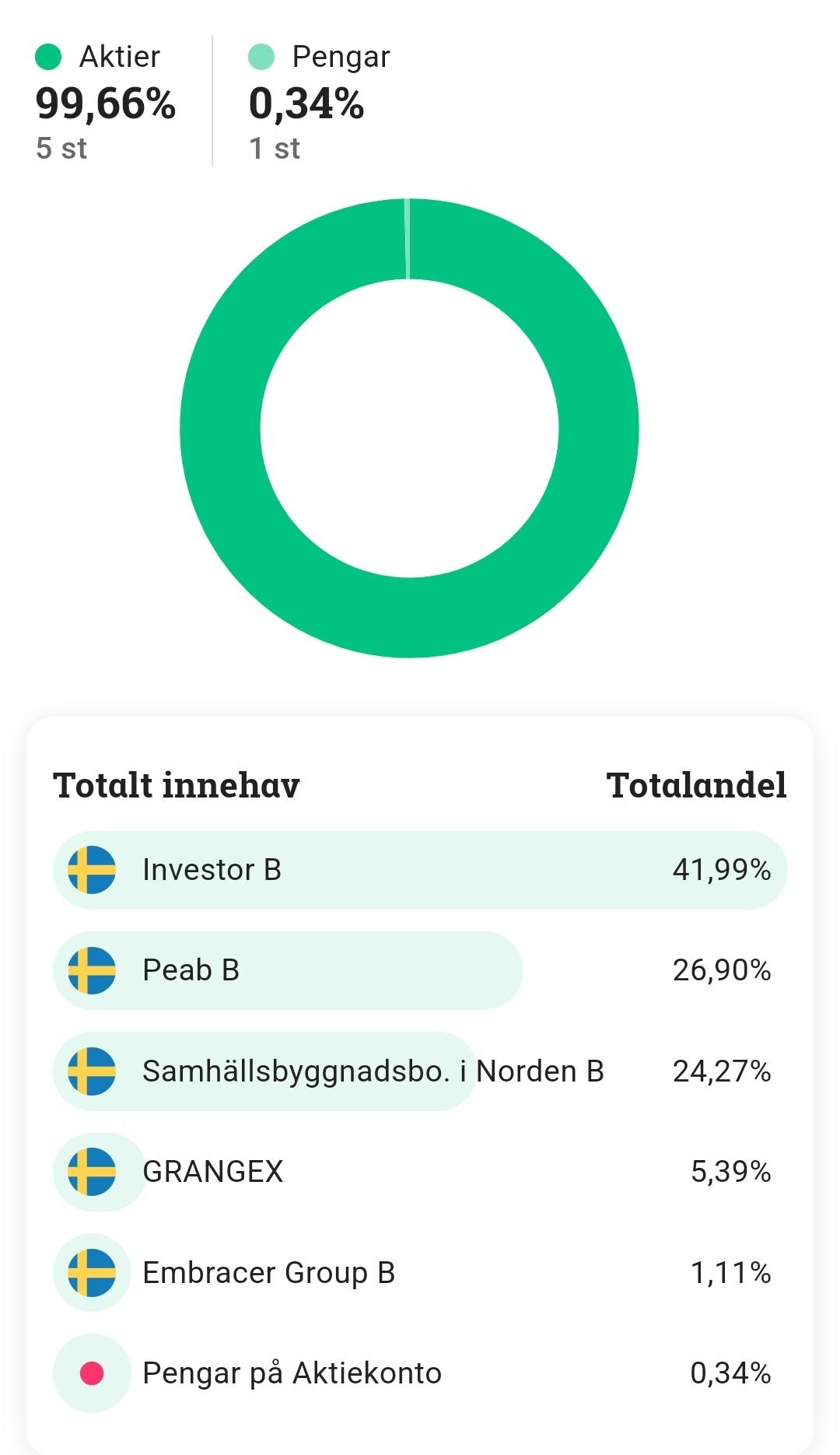 Premiepensionen har till största delen AP7 Aktiefond, med lite småbolag, fastigheter och Sverige utöver det.