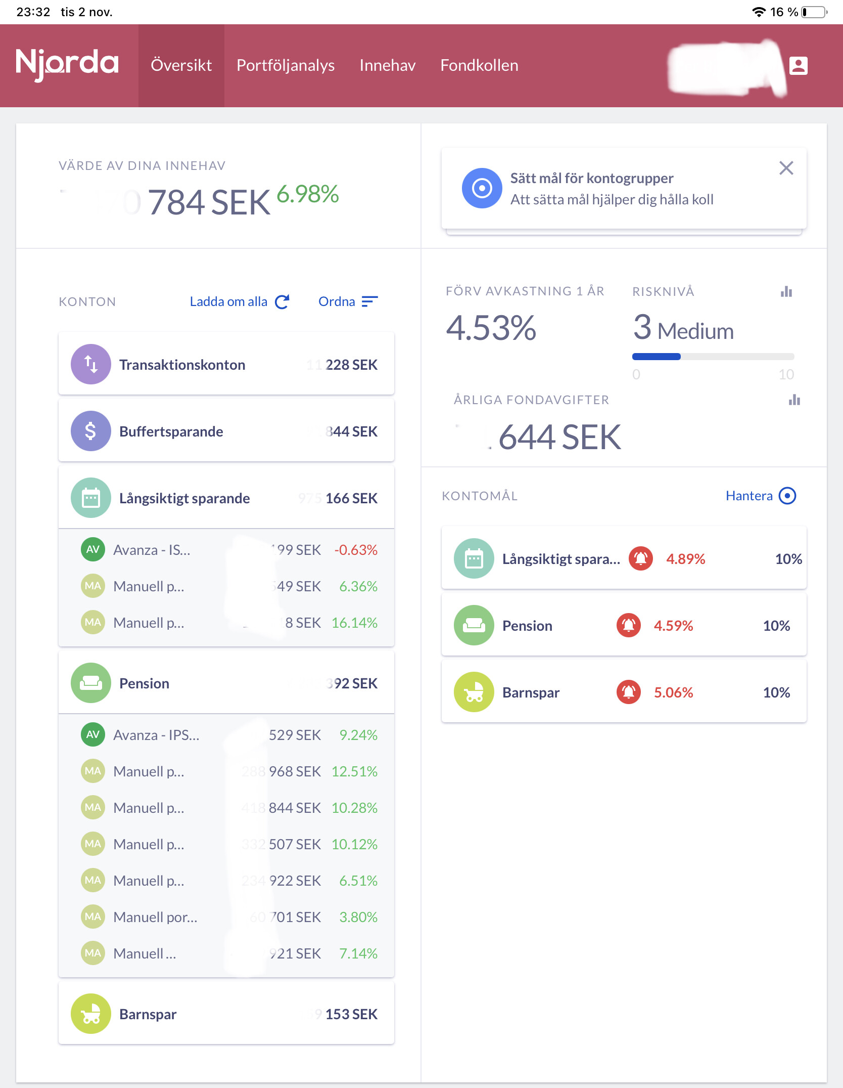 När man väl gjort jobbet blir översikten riktigt bra. Man kan följa totalen, samt få analyser på fondavgifter med förslag på bättre alternativ. Man kan sätta mål som det jämförs mot.