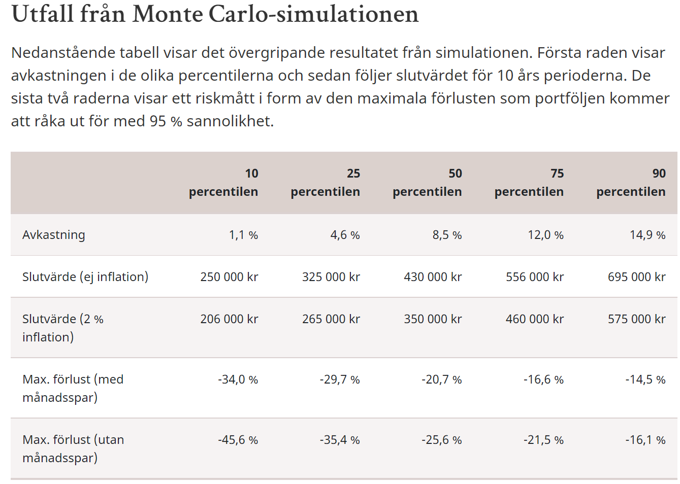 Begrunda följande tabell från Monte Carlo-simulationer på Globala Barnportföljen (90/10) och fundera om du är okej med drawdown-risken Notera dock att det här är siffror över en 10-årsperiod.