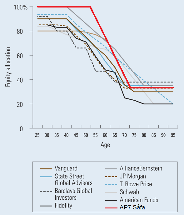 Om mina ögon ljuger inte alldeles för mycket ser jag i grafiken två pensionsbolag som har 43% aktier vid 75-års ålder. Det är ganska mycket när medellivslängden är under 80 (som beror til stor del på livsstil och droger. De sunda och drogfria amerikaner blir säkert lika gamla som svenskarna).